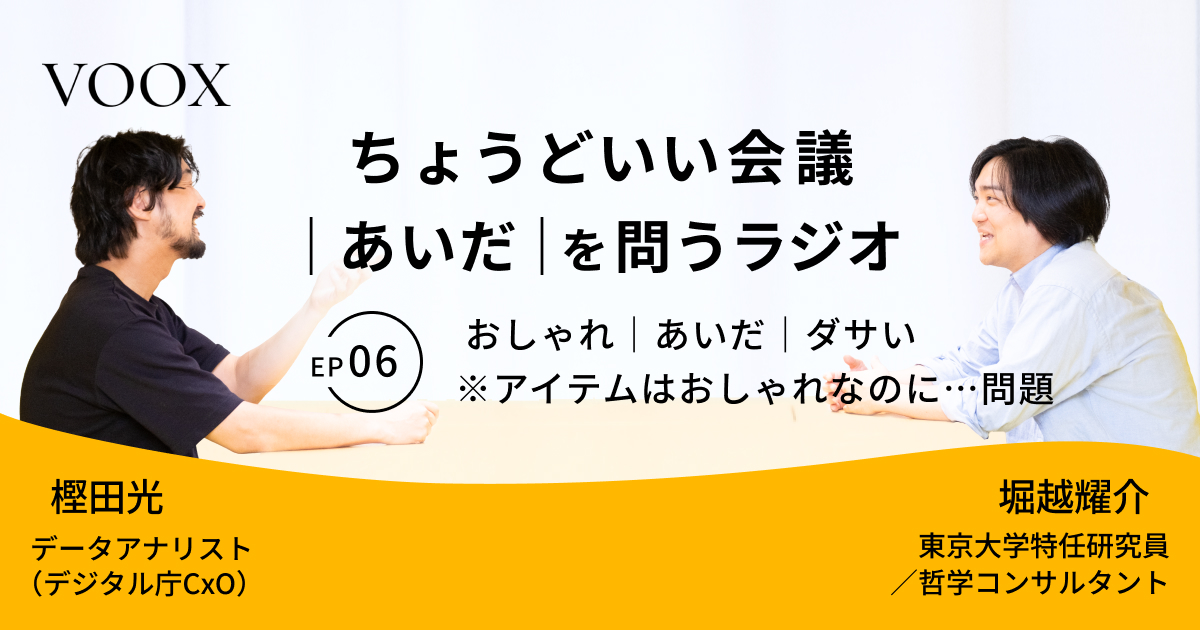 ちょうどいい会議|あいだ|を問うラジオ『Ep6: おしゃれ|あいだ|ダサい ※アイテムはおしゃれなのに…問題』音声教養メディアVOOX/Spotifyにて、配信開始!