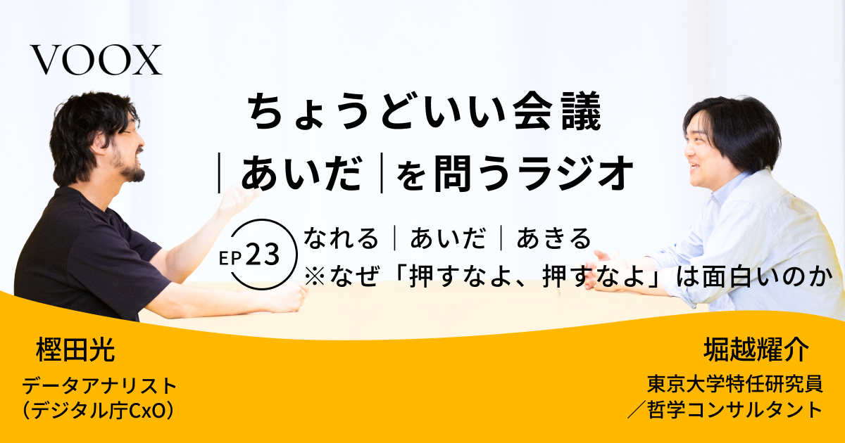 ちょうどいい会議|あいだ|を問うラジオ『Ep23: なれる|あいだ|あきる ※なぜ「押すなよ、押すなよ」は面白いのか』音声教養メディアVOOX/Spotifyにて、配信開始!