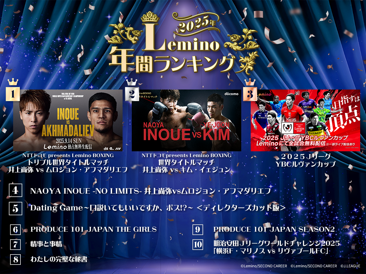 「2025年Lemino年間ランキング」を発表!1位は日本中が熱狂した「トリプル世界タイトルマッチ 井上尚弥 vs ムロジョン・アフマダリエフ」オリジナルドラマやタイドラマ、韓流ドラマもランクイン!