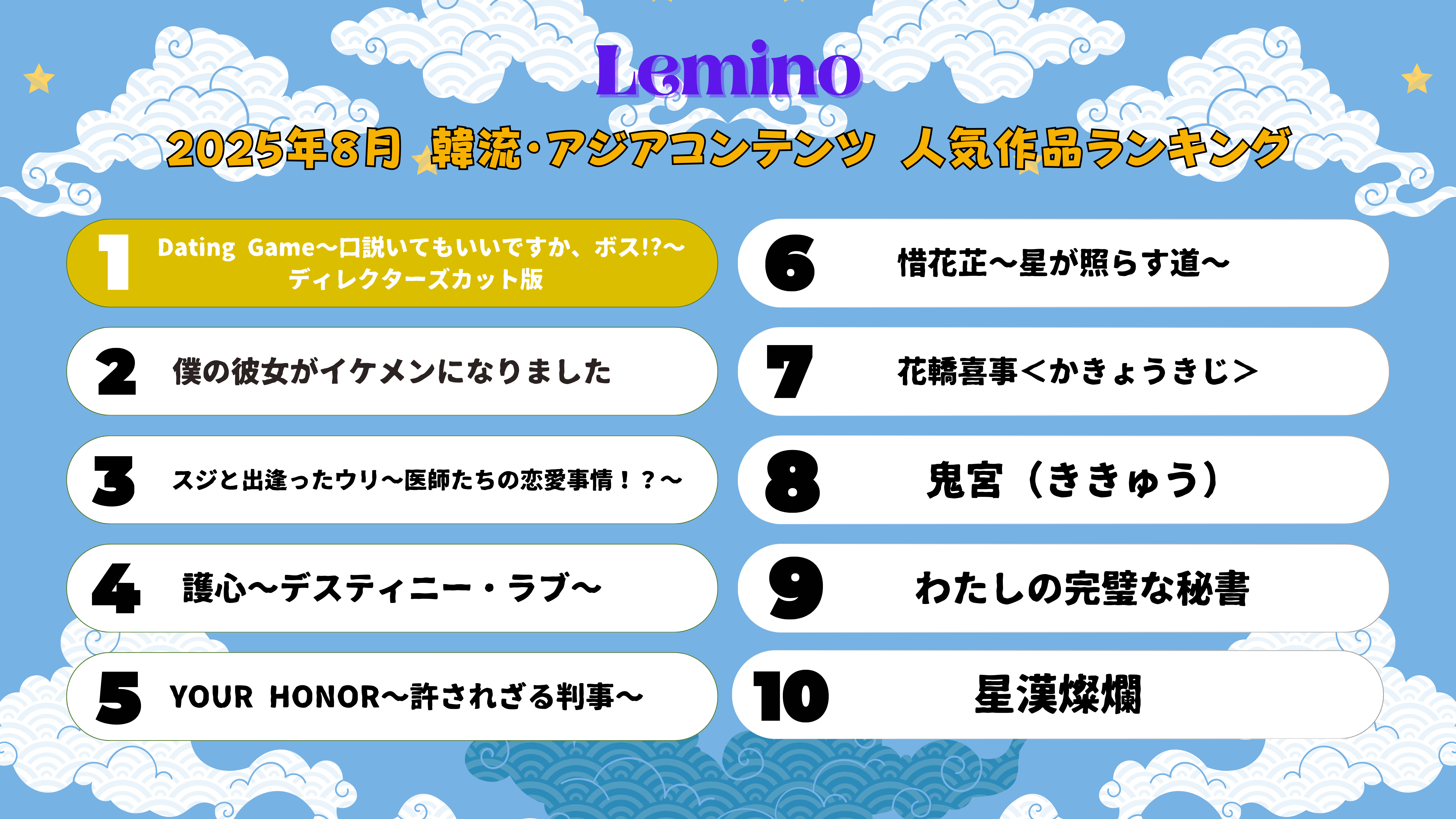 8月のLemino韓流・アジア人気ランキング発表!! 『Dating Game~口説いてもいいですか、ボス!?~』 ディレクターズカット版が2ヵ月連続で1位にランクイン!