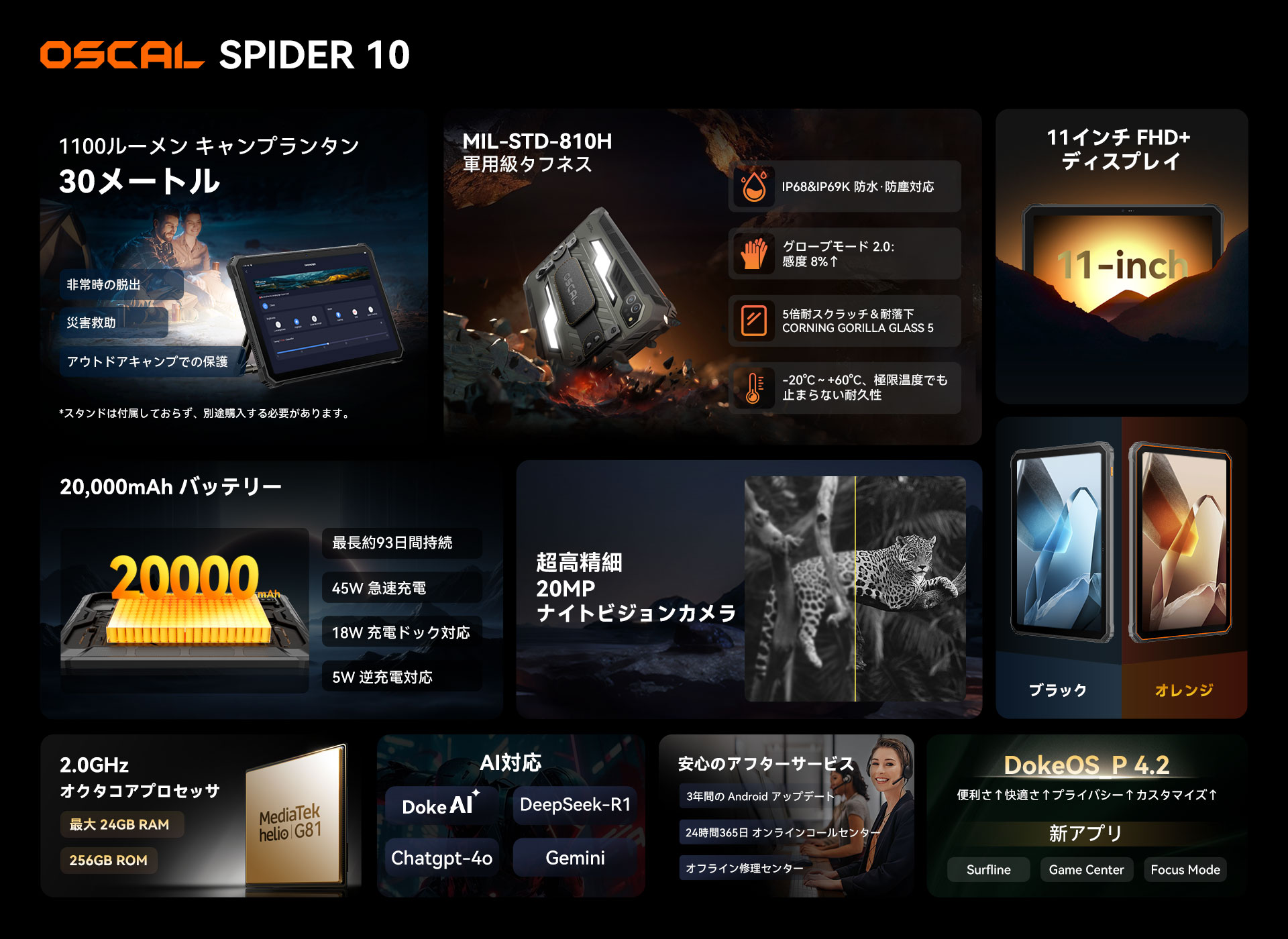 OSCAL SPIDER 10 間もなく登場:1100LMランタン・20,000mAhバッテリー・20MPナイトビジョン搭載のフラッグシップのタフネスタブレット