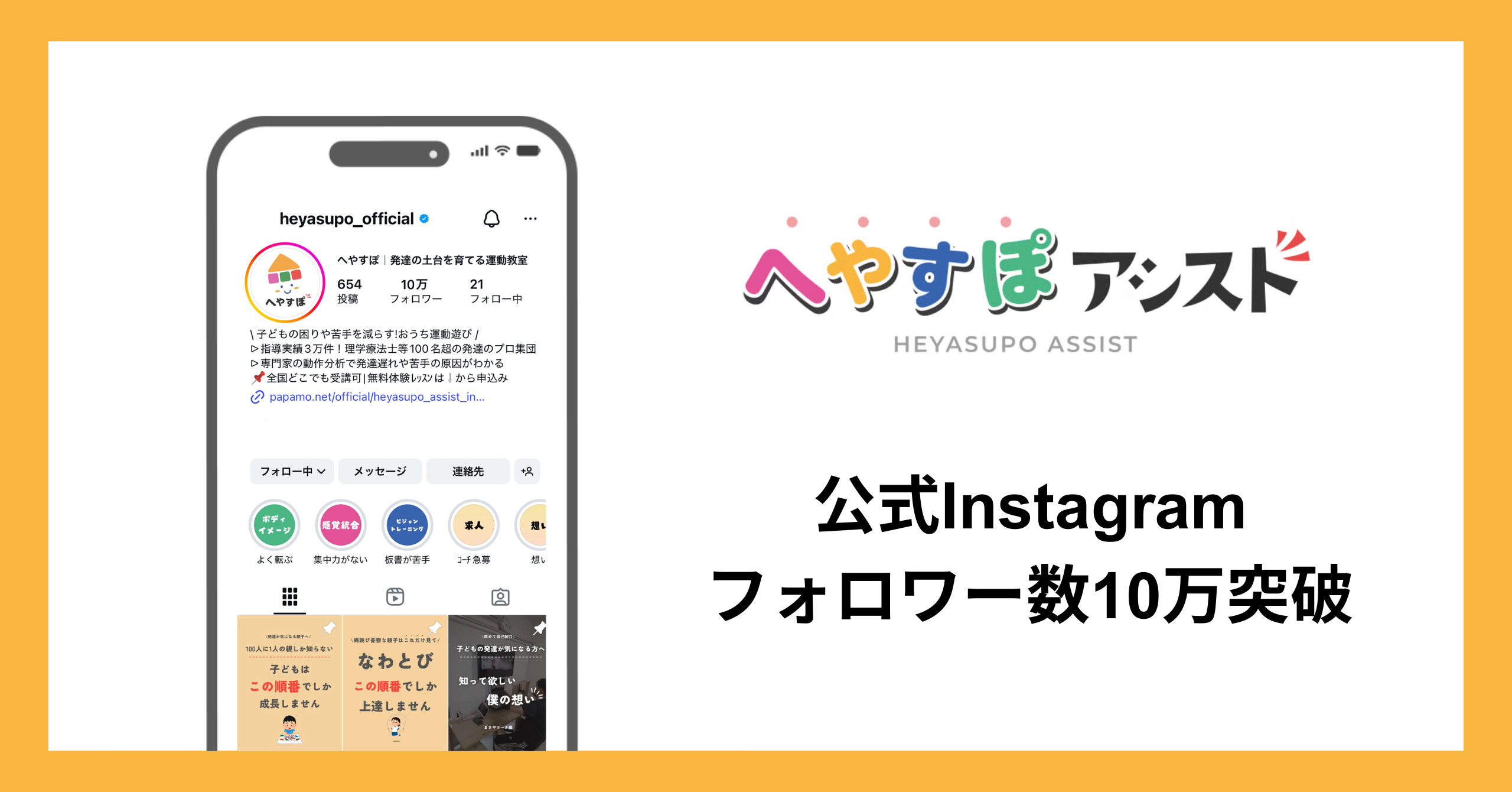 運動×テクノロジーによる発達支援サービス「へやすぽアシスト」、公式Instagramのフォロワー数が10万を突破
