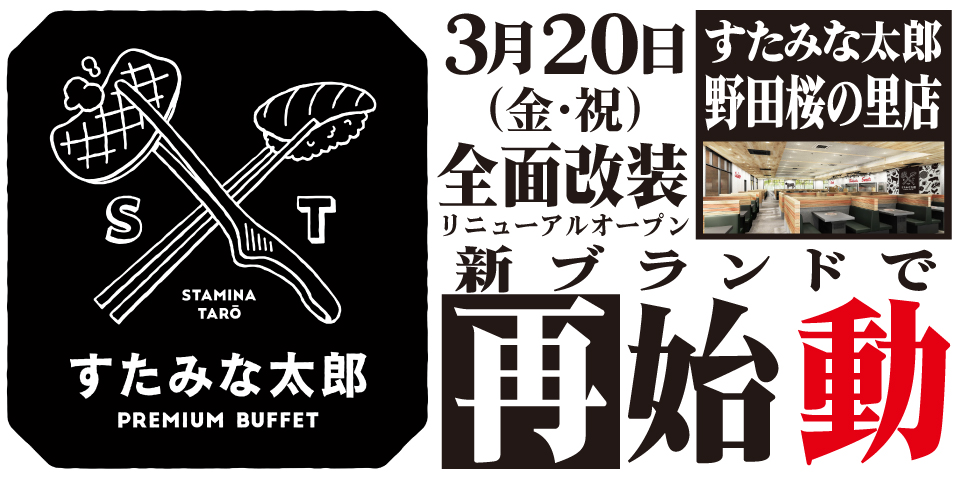 焼肉、寿司食べ放題の「すたみな太郎 野田桜の里店」が3/20(金・祝)全面改装オープン!「すたみな太郎 PREMIUM BUFFET 野田桜の里店」として再始動!