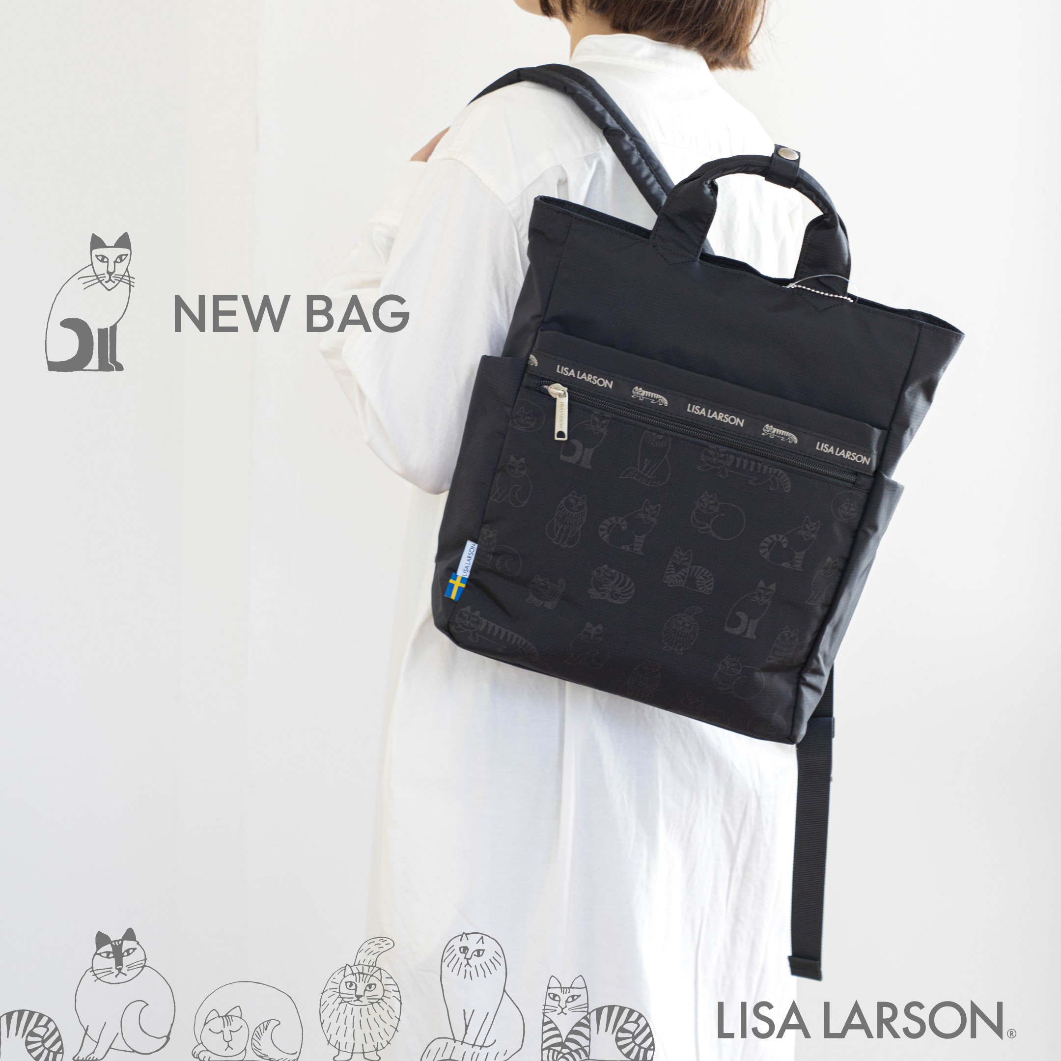 【新発売】リサ・ラーソンの「スケッチねこたち」が軽やかなバッグに。軽量・撥水仕様の新作2型が登場。