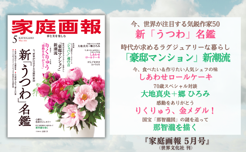『家庭画報 5月号』4月1日発売 新「うつわ」名鑑/【対談】大地真央+郷 ひろみ/りくりゅう、金メダル!/「豪邸マンション」新潮流/しあわせロールケーキほか