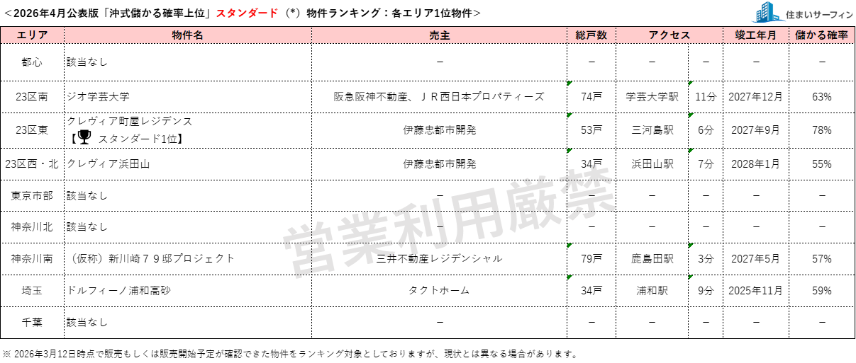 [住まいサーフィン]資産性の保たれやすいマンションがわかる首都圏エリア別「沖式儲かる確率上位マンションランキング」2026年4月版公表