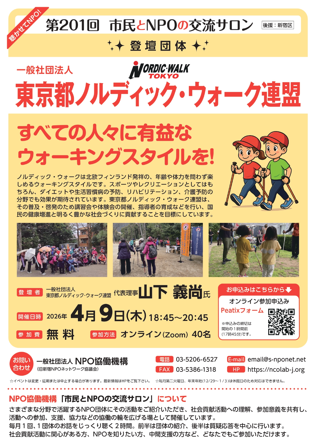 【第201回 市民とNPOの交流サロン】(登壇団体:一般社団法人 東京都ノルディック・ウォーク連盟)を開催します!