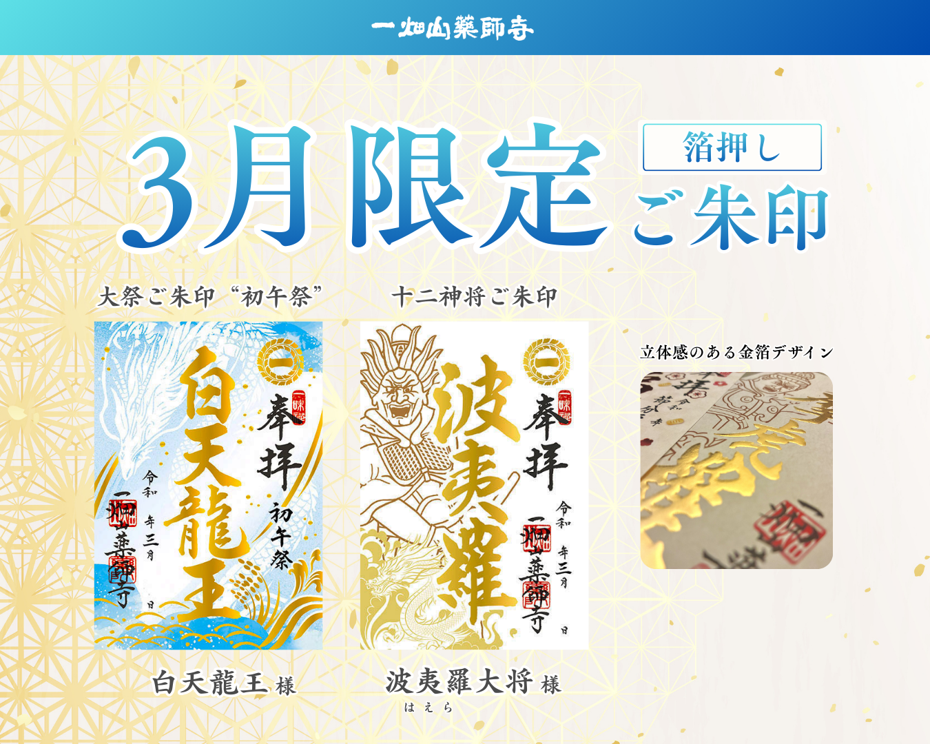 一畑山薬師寺が、3月限定「箔押しご朱印」を頒布開始。3月のご朱印は「白天龍王」様・「波夷羅(はえら)大将」様