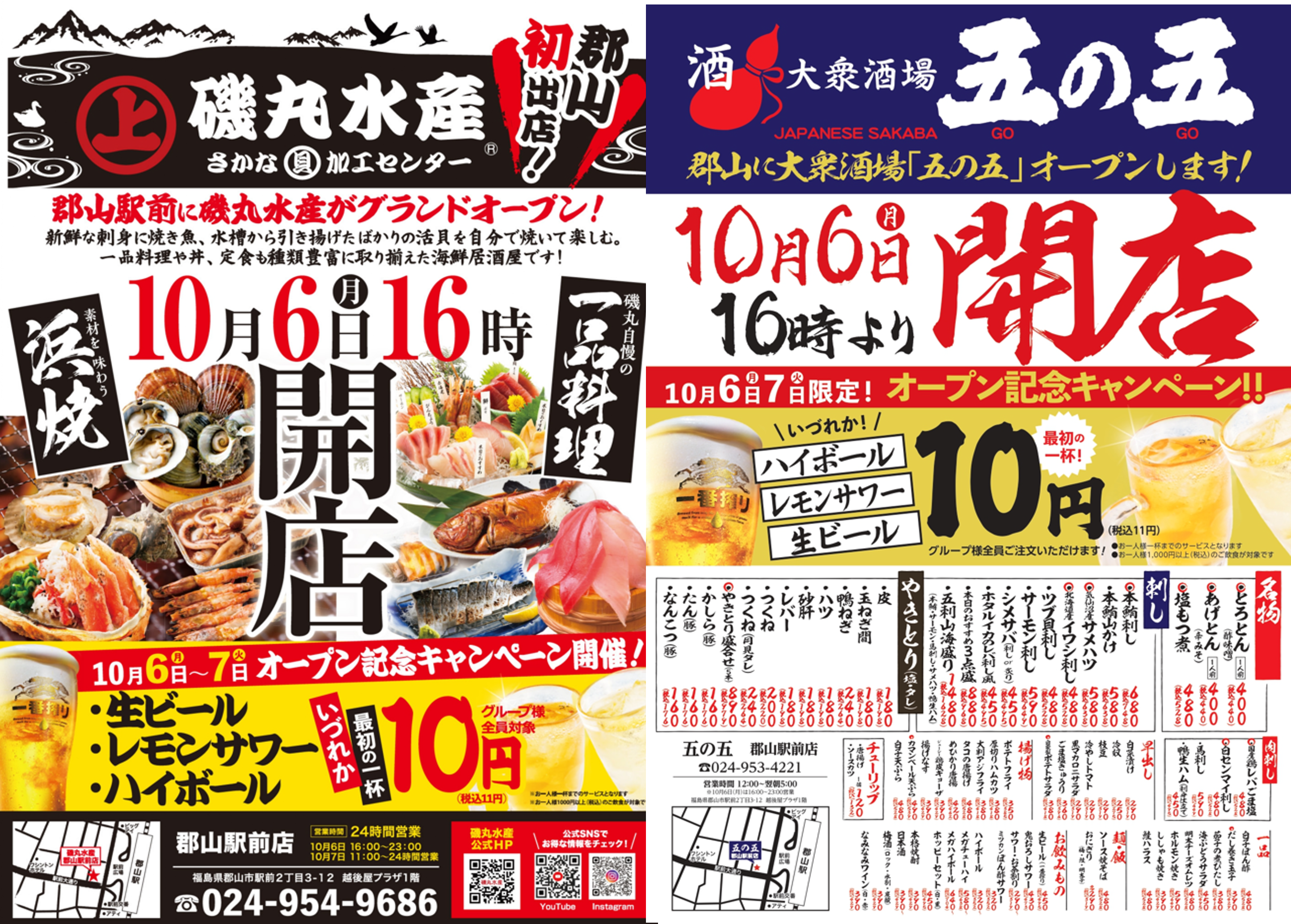 はしご酒確定!「磯丸水産」と「五の五」が郡山にやってくる! 10月6日(月) 16:00 同時オープン♪