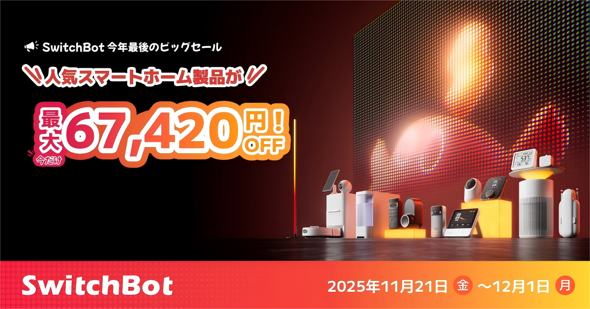 【SwitchBot】公式ストア限定最大59,020円OFF!秋の感謝祭セール開催。防犯・照明・季節家電まで、暮らしを支えるスマート製品が最大53%OFFに