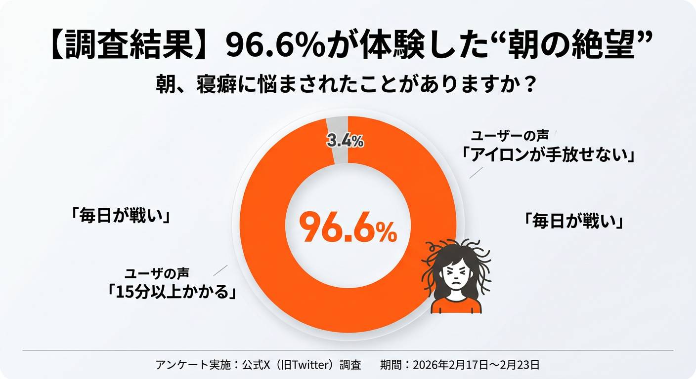 【サロン専売ヘアケア T・J株式会社】朝の寝癖に関するアンケート調査を実施。96.6%が「朝の寝癖」に悩み。独自の弱酸性設計で朝の15分を解放。