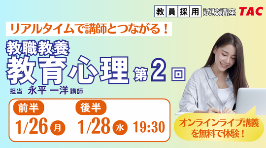 【TAC教員採用試験】オンライン体験講義「教職教養教育心理第2回(後半)」を2026/1/26(月)・28(水)に開催!