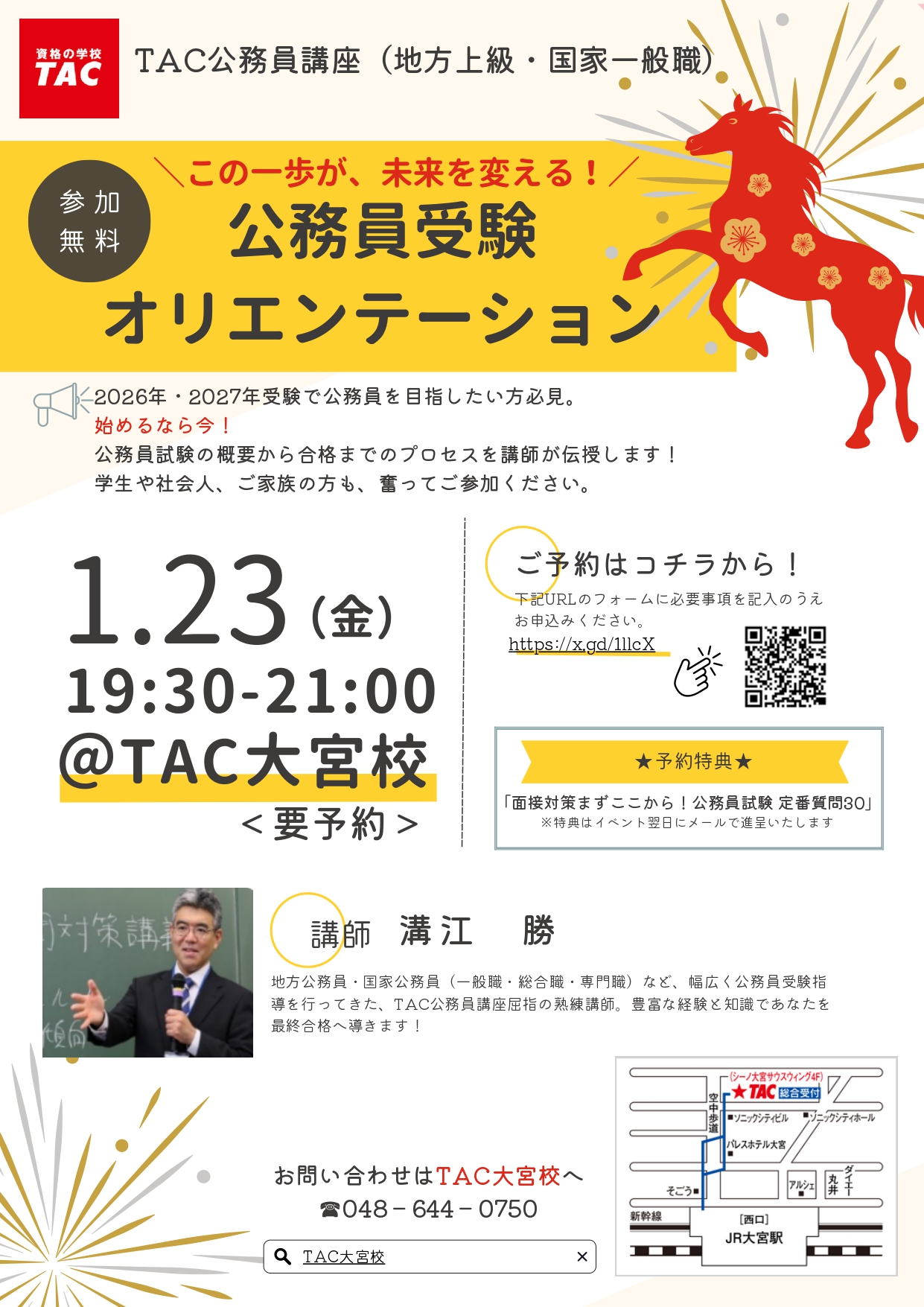 【TAC公務員】「この一歩が、未来を変える!公務員受験オリエンテーション」を1/23(金)にTAC大宮校で開催!<参加無料・要予約>