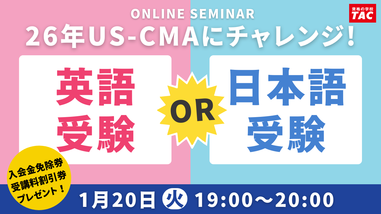 【TAC】US-CMA(米国公認管理会計士)「26年US-CMAにチャレンジ~英語受験or日本語受験~」オンラインセミナー 1/20(火)19:00~開催!