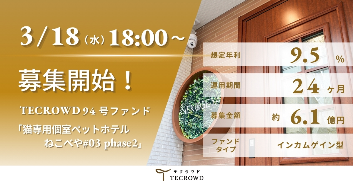 【想定年利9.5%】国内インカムゲイン型ファンド「猫専用個室ペットホテル ねこべや#03 phase2」に投資するTECROWD94号ファンドの先行情報を公開