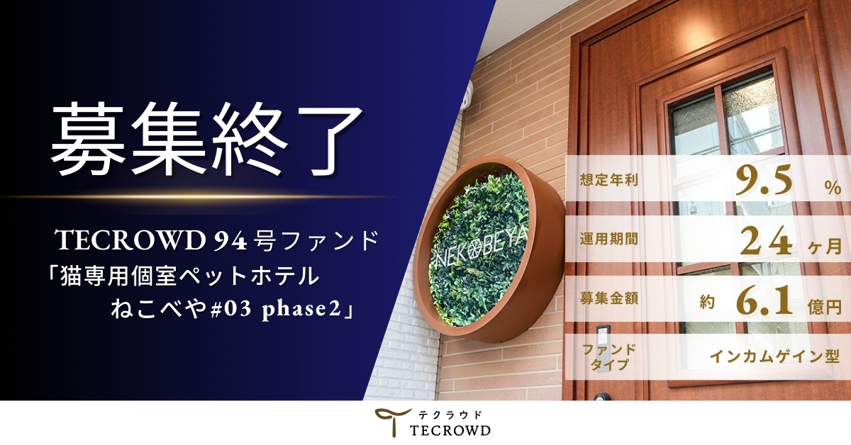 【想定年利9.5%】国内インカムゲイン型ファンド「猫専用個室ペットホテル ねこべや#03 phase2」に投資するTECROWD93号ファンドの募集終了