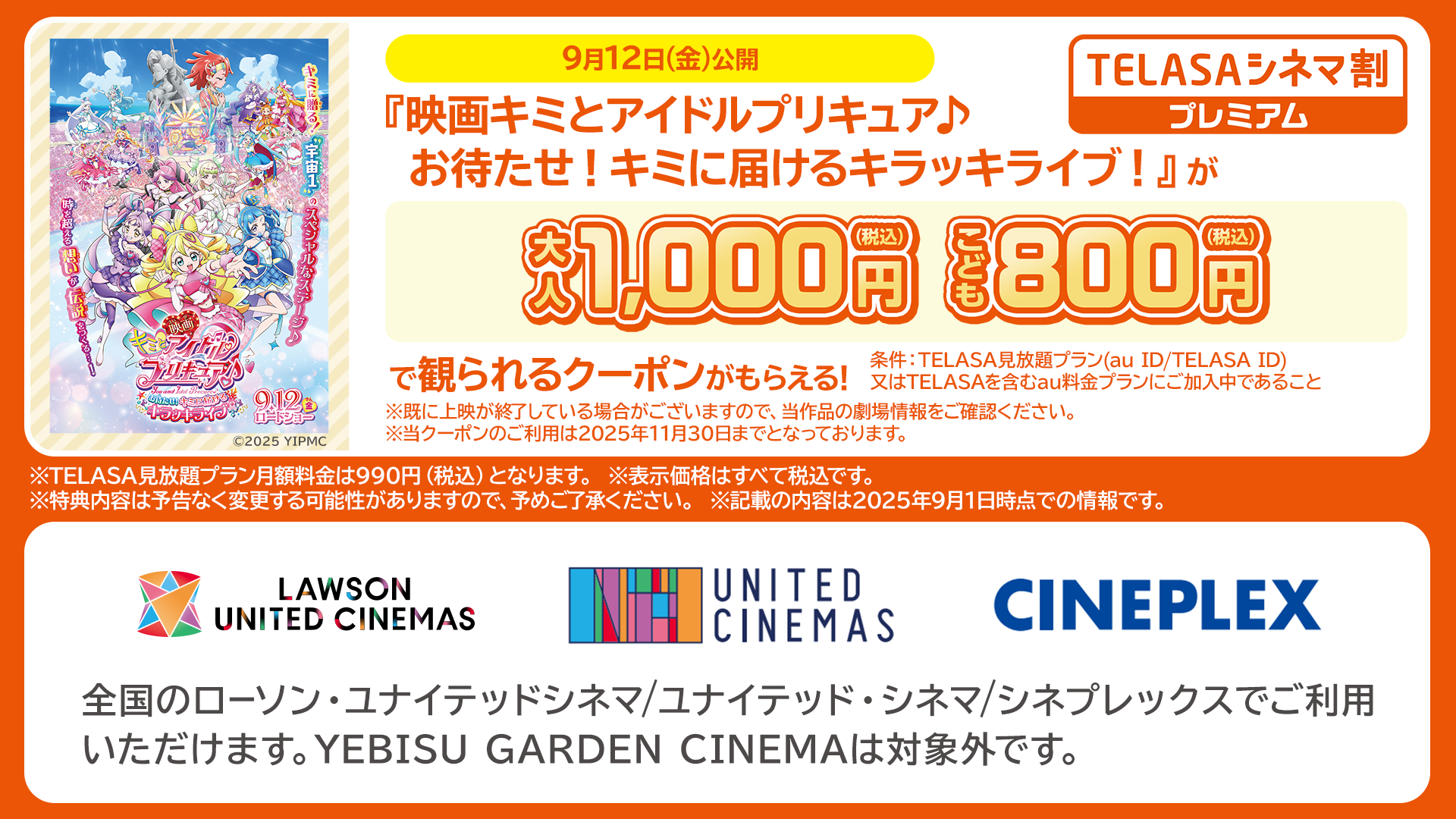 『映画キミとアイドルプリキュア♪ お待たせ!キミに届けるキラッキライブ!』をもっとお得に!TELASAから大人1,000円で映画を観られる「TELASAシネマ割プレミアム」を提供開始