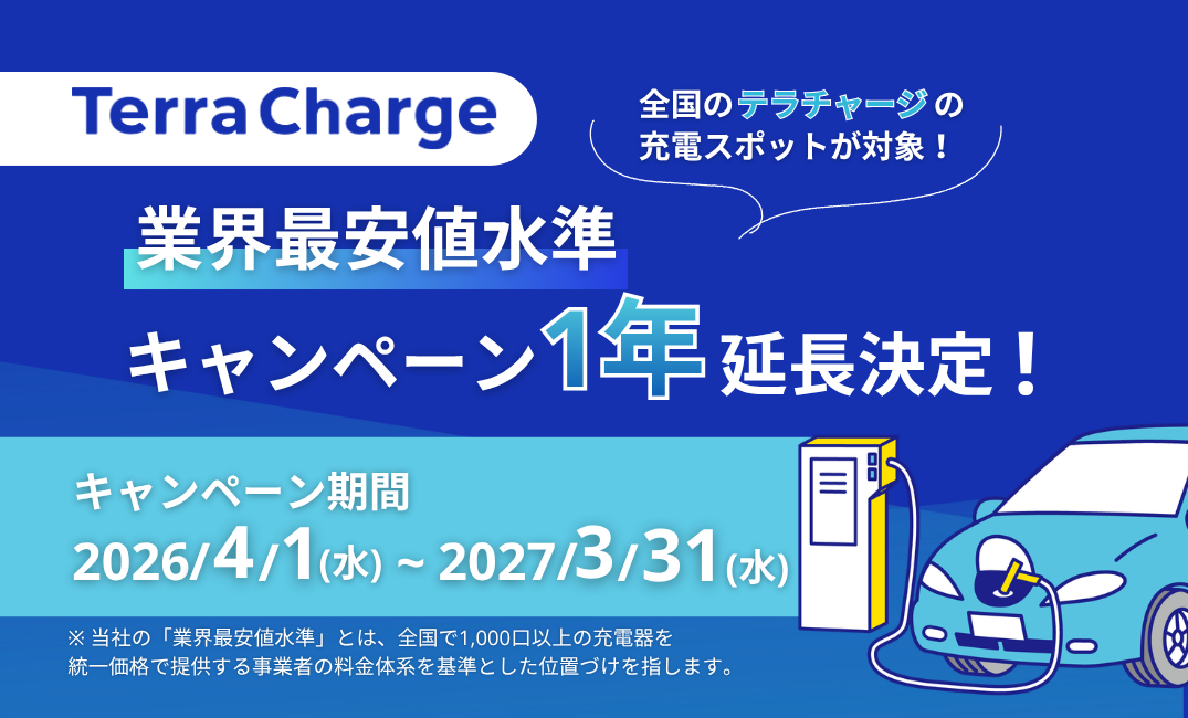 テラチャージ、EV充電料金「業界最安値水準キャンペーン」の1年延長を決定!
