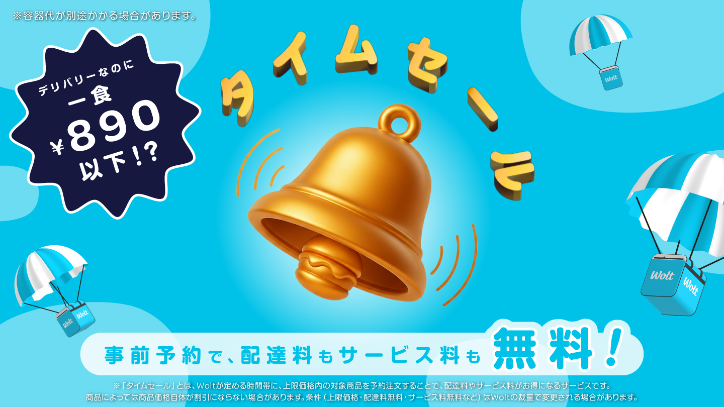Woltの新サービス「タイムセール」、東京都内でスタート!事前予約でお支払いが総額890円以下!配達料とサービス料が無料に!
