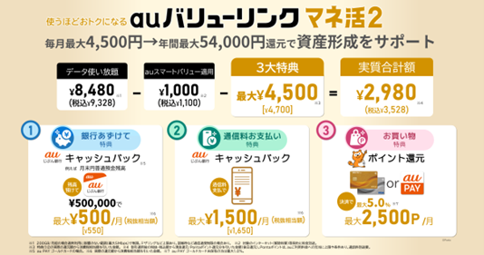 auじぶん銀行特典を強化した「auバリューリンク マネ活2」を提供開始
