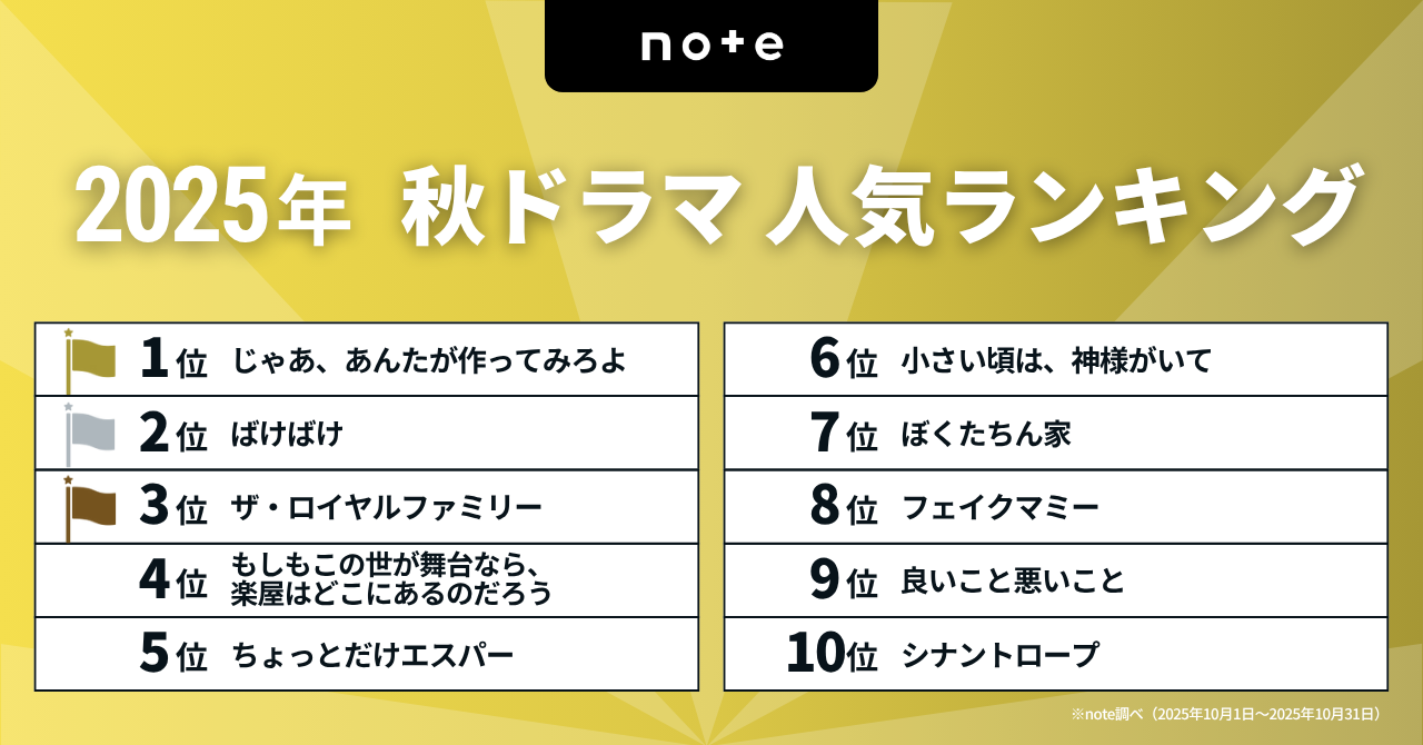 今見るべき!2025秋ドラマランキングを発表!1位は、夏帆×竹内涼真のW主演の『じゃあ、あんたが作ってみろよ』(PR TIMES トレンド)