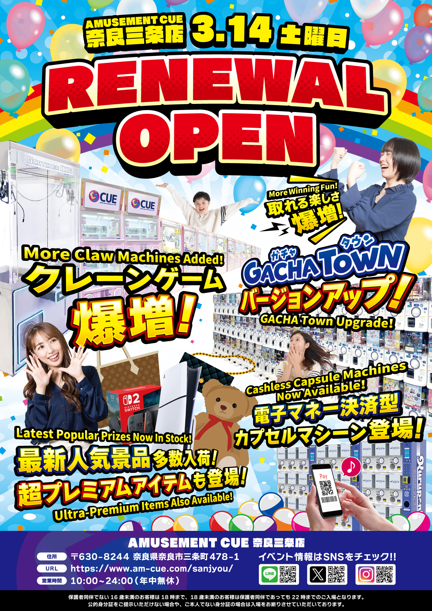 令和8年3月14日 アミューズメントCUE奈良三条店リニューアルオープン!
