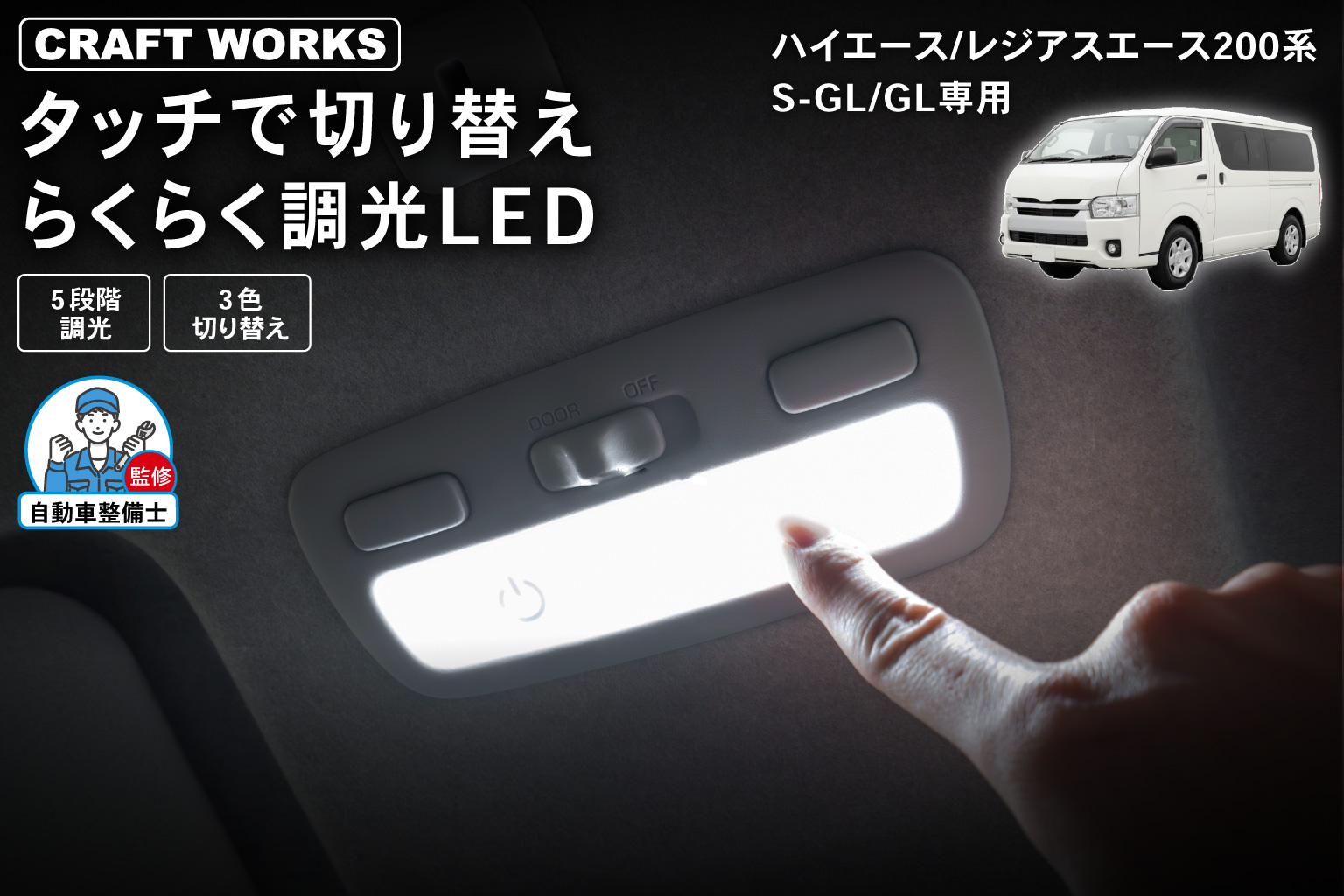 【新発売】ハイエース/レジアスエース 200系S-GL/GL専用 タッチ操作で簡単に切り替えできる調光LEDルームランプを発売。3色の色味と5段階の明るさをワンタッチで自在に調整、車内空間を快適に演出