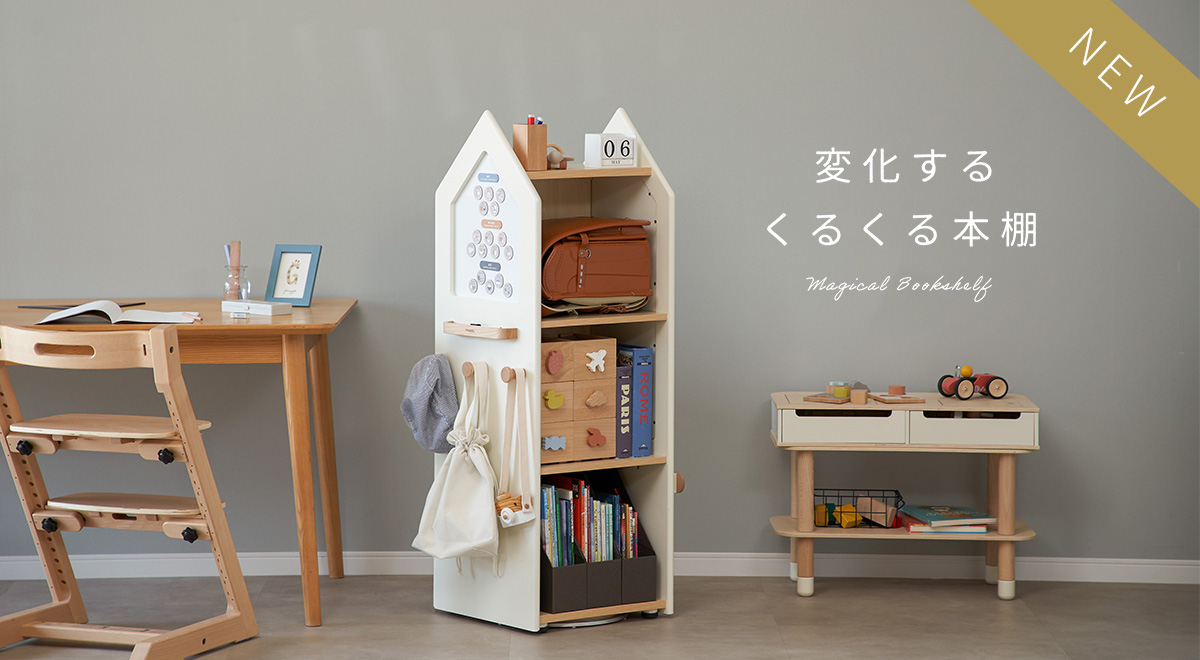 人気ママインフルエンサーコラボ企画!約2年の開発期間を経て商品化!ベビーキッズブランド「HOPPL」よりお子さまの成長に寄り添う回転収納ラック「変化するくるくる本棚」が新登場