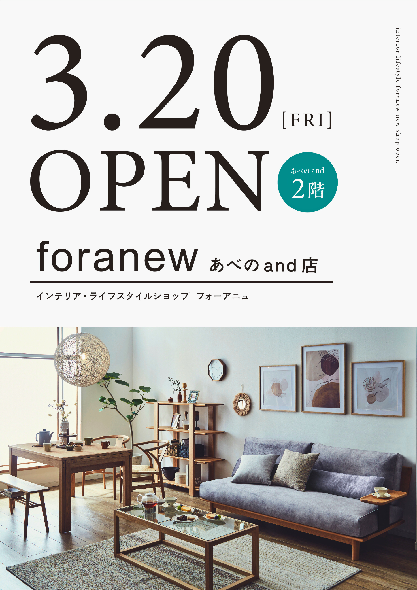 わたしらしく心地よい暮らしを提案するインテリアショップ「foranew(フォーアニュ)あべの店」が、2026年3月20日(金)に「あべのand」2階にオープン!