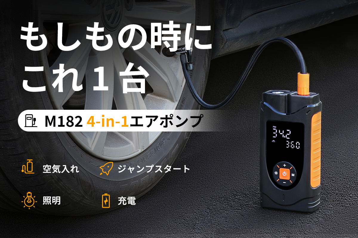 空気入れ・ジャンプスタート・照明・充電。1台で全てをこなすエアポンプ「M182」。4月28日(火)11時にCAMPFIREにて登場。今すぐ事前登録最大50%OFF!