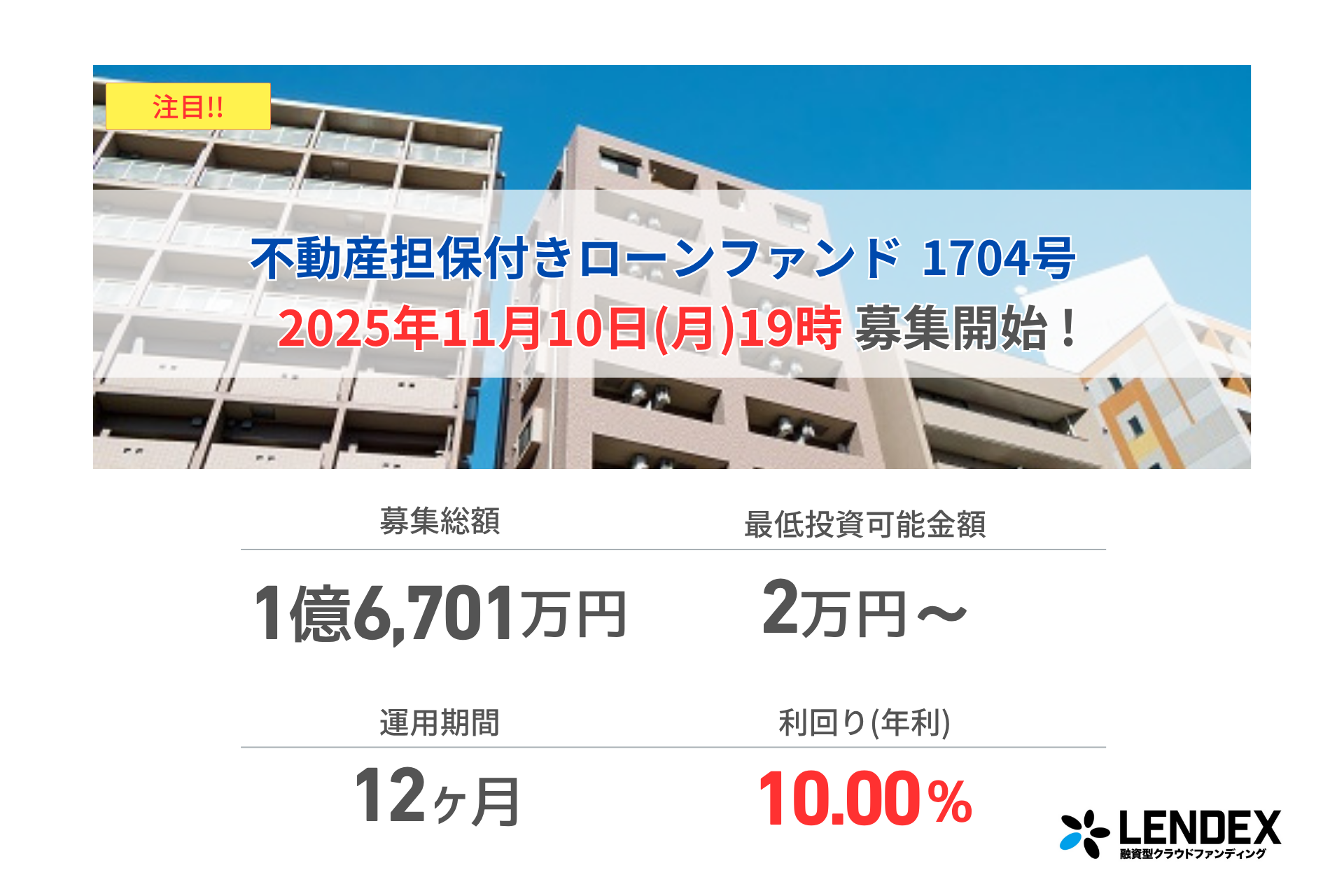【LENDEX】本日開始、不動産担保付きローンファンド1704号の募集開始のお知らせ
