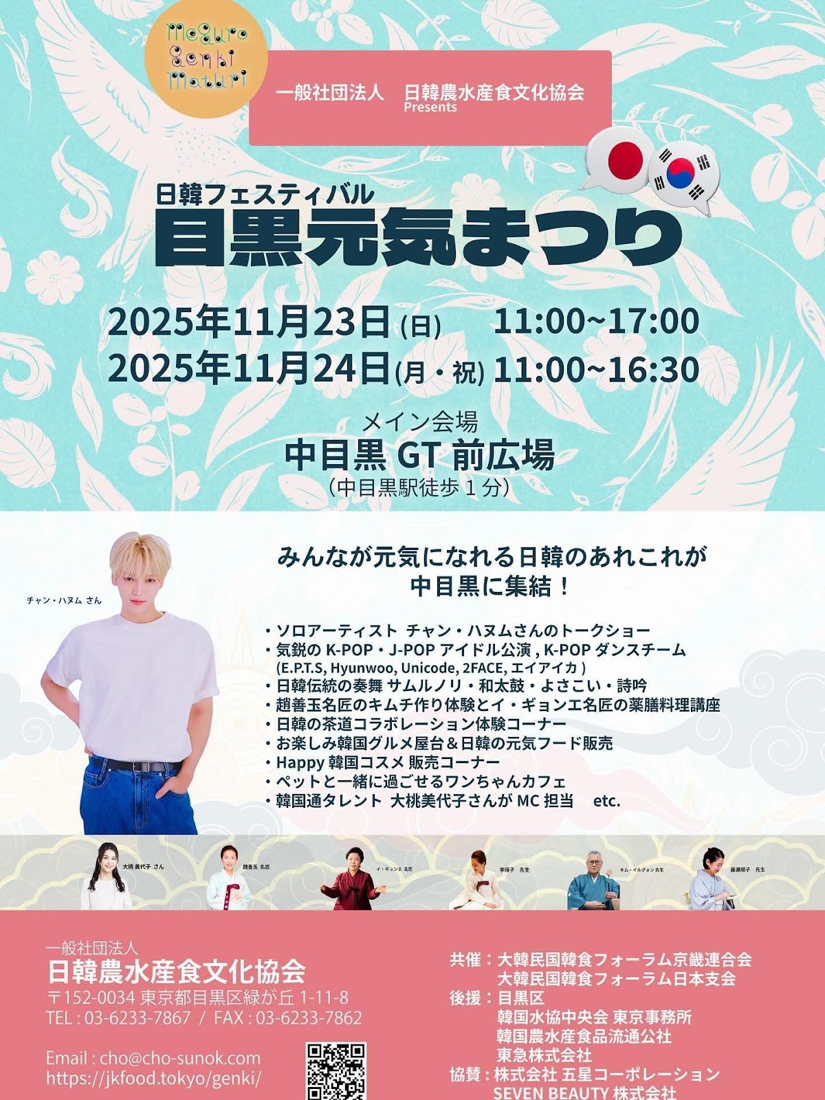 韓国の健康食をメインとした「日韓交流フェスティバル 目黒元気まつり」東京・中目黒にて11月23日、24日開催 ~ 人気歌手チャン・ハヌムさんのトークショーほか舞台公演も充実
