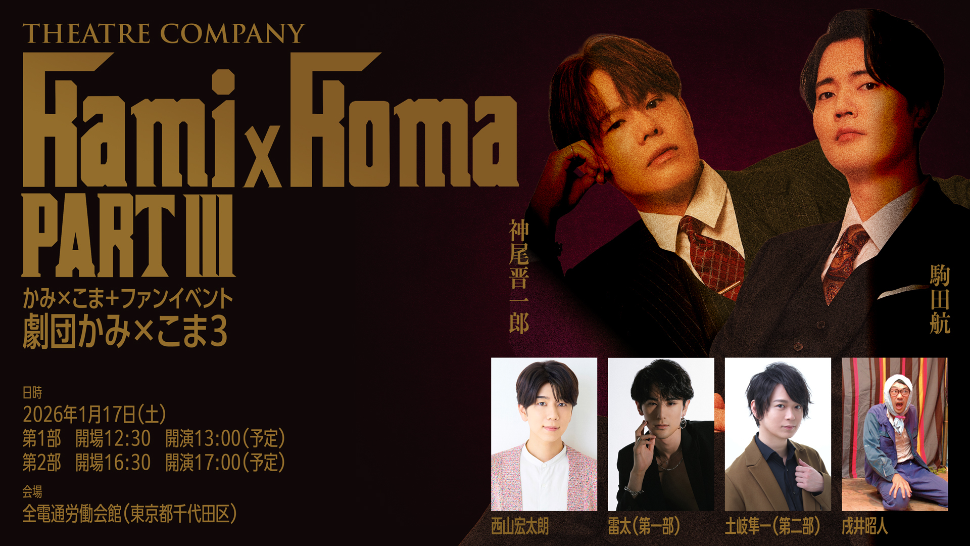 神尾晋一郎と駒田航の『かみ×こま+』が、西山宏太朗、雷太、土岐隼一ら豪華ゲストを迎えてファンイベント『劇団かみ×こま3』を2026年1月17日(土)開催! -