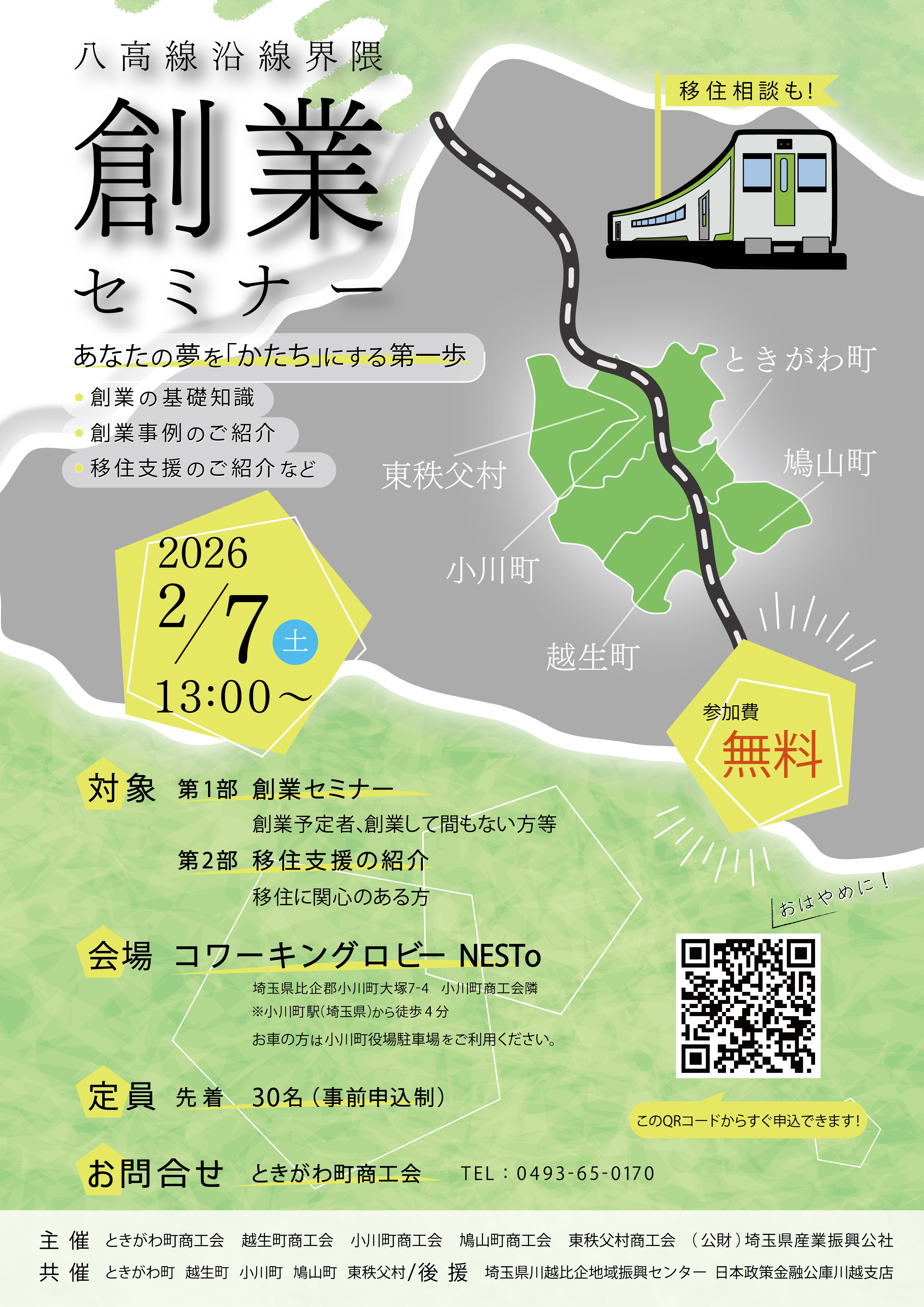 消滅可能性を「創業」で変える。埼玉県・八高線沿線界隈の5町村の商工会が広域連携し、「移住×創業セミナー」を2月7日に開催