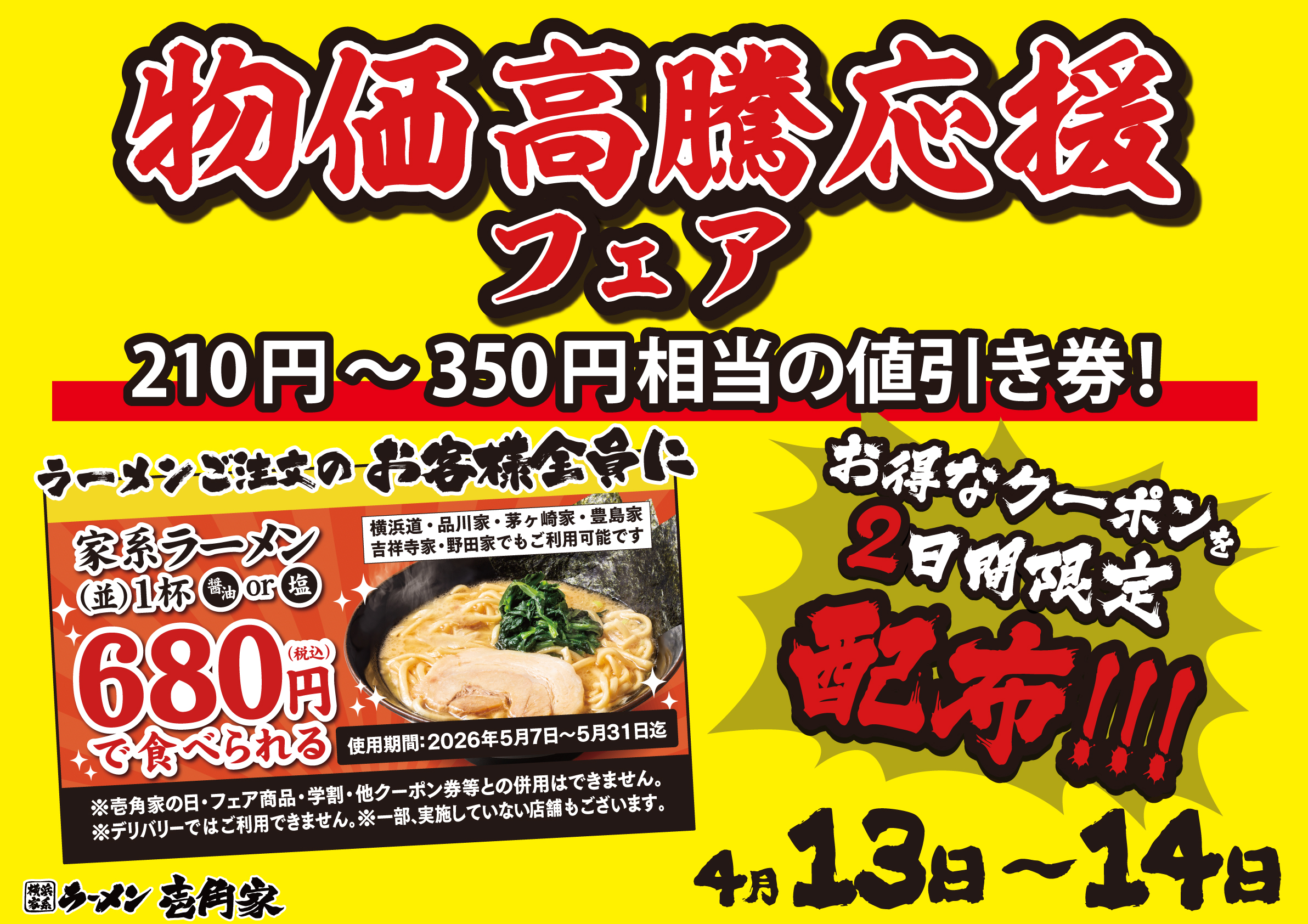 2日間限定!期間限定で使える最大350円引きのクーポンを配布!壱角家 物価高騰応援フェア 開催!