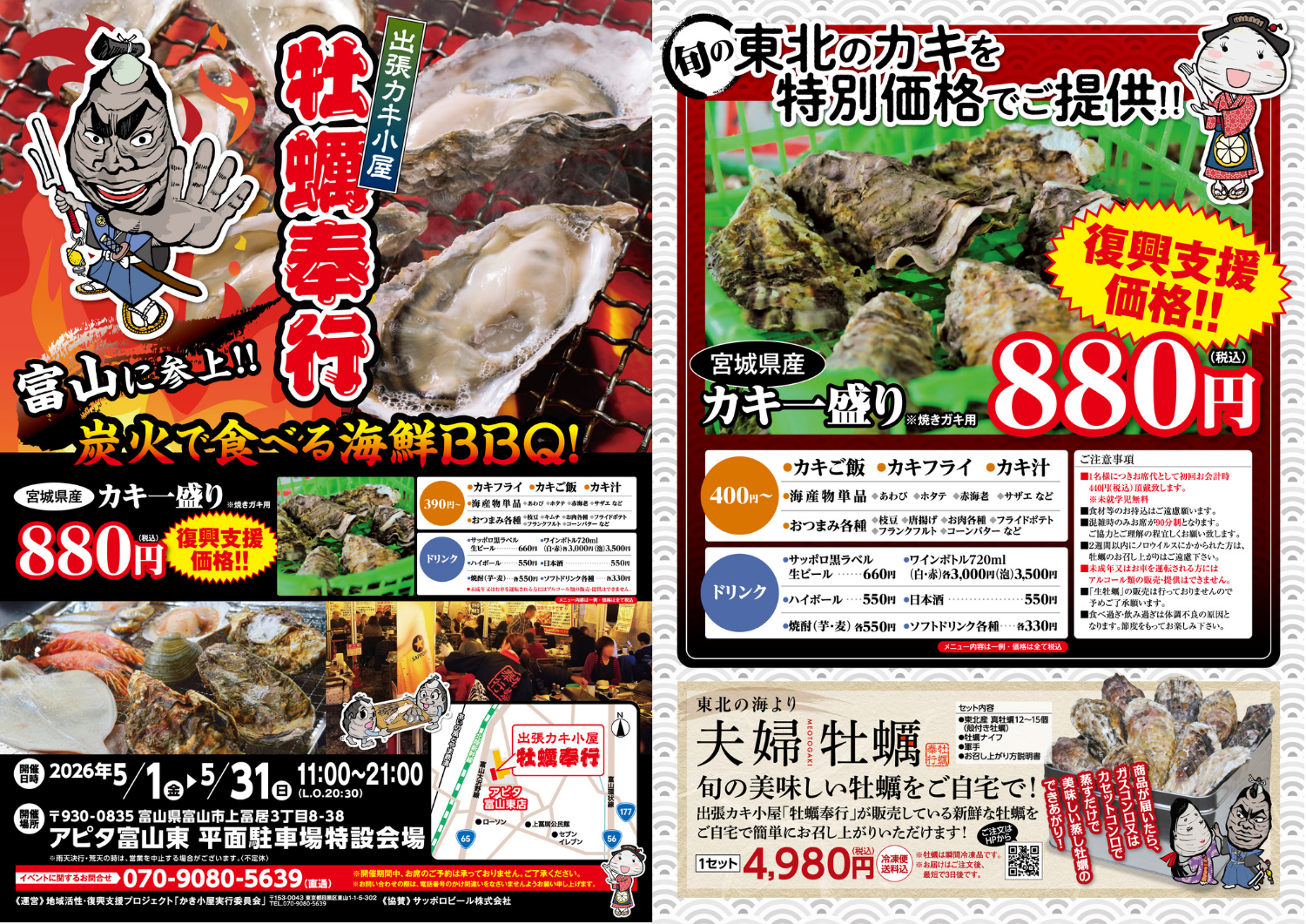 富山県富山市に「出張カキ小屋」参上! 5月1日~期間限定開催!《 宮城県産殻付き牡蠣が一盛り880円!! 》