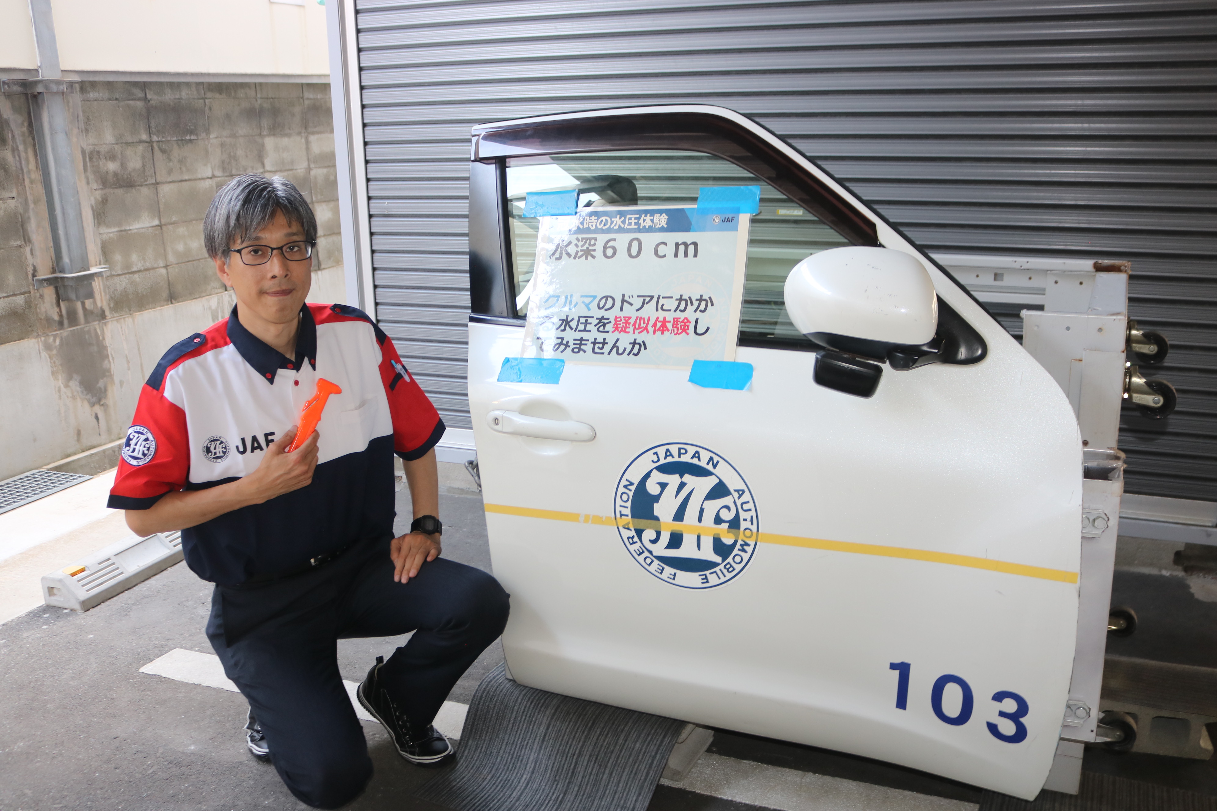 【JAF福岡】「知って安心 やって楽しい 防災デイ」にJAFブース出展~クルマ冠水時のドア開放の重さを体験~