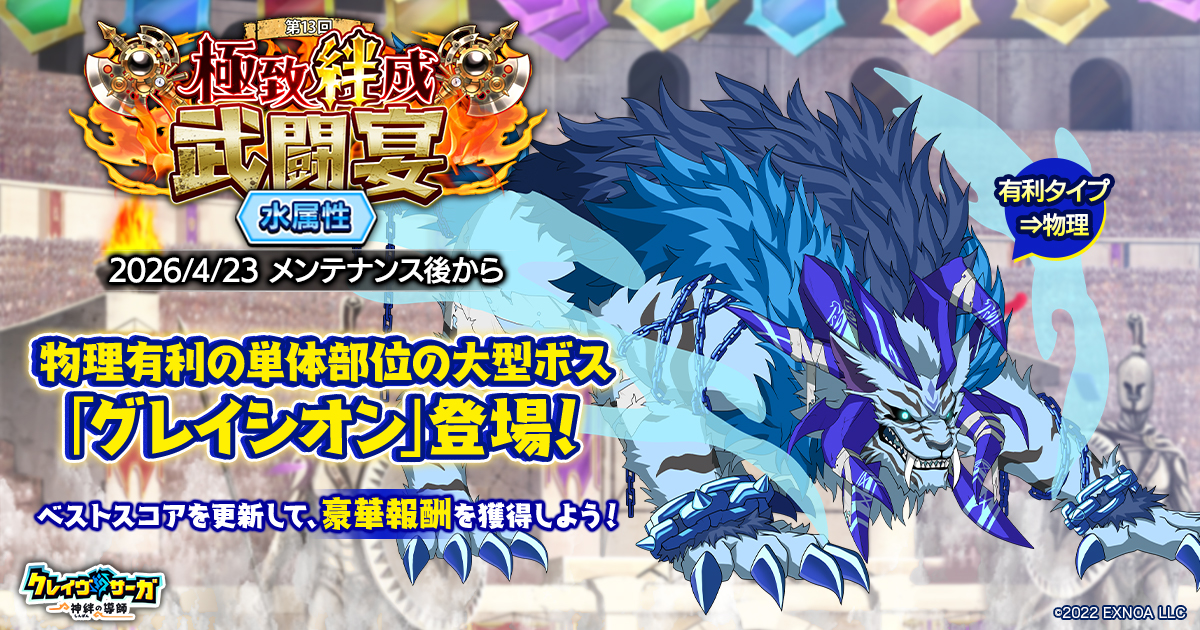 『クレイヴ・サーガ 神絆の導師』大型ボスに挑む第13回「極致絆成武闘宴」開催!各種期間限定ガチャやお得なパック販売なども登場!