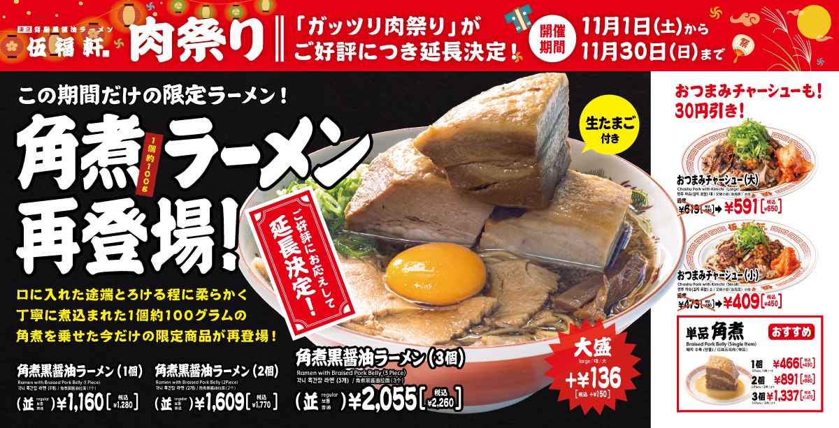 【伍福軒】大好評につき『肉祭り』開催期間を延長!『角煮ラーメン』が11月30日まで楽しめる! -