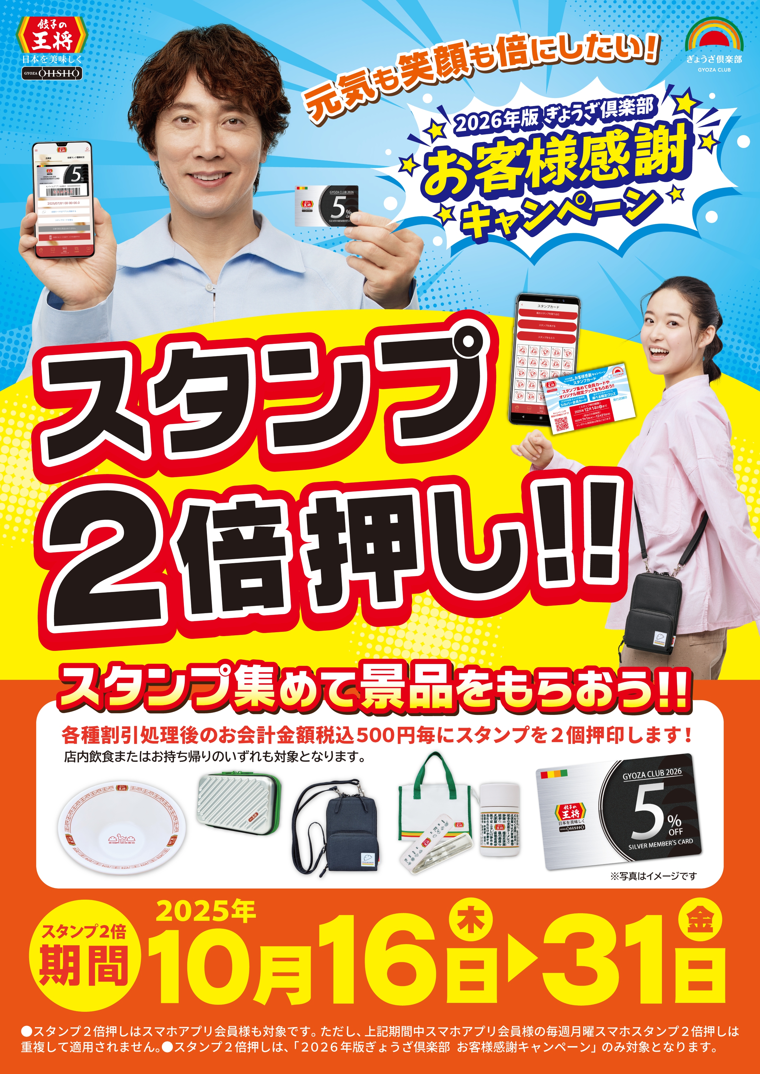 【餃子の王将】期間限定でスタンプ2倍押し!「2026年版ぎょうざ倶楽部お客様感謝キャンペーン」 -