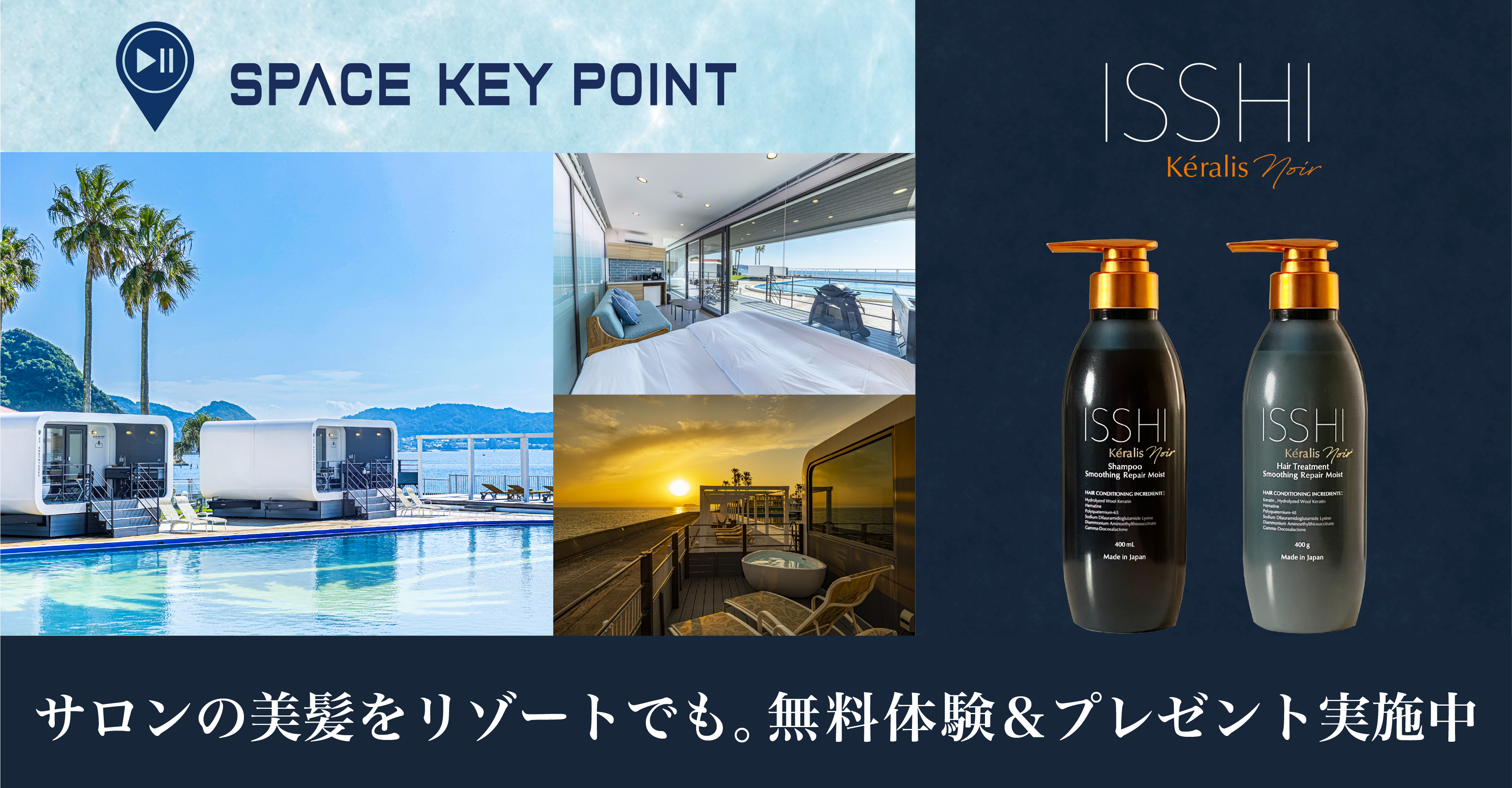 ISSHI発ダメージケアKeralis noir(ケラリスノワール)。逗子「スペースキーポイント」宿泊者限定!プロ指向成分で傷んだ髪を立て直す“土台ケア”シャンプートリートメントを体験&現品プレゼント