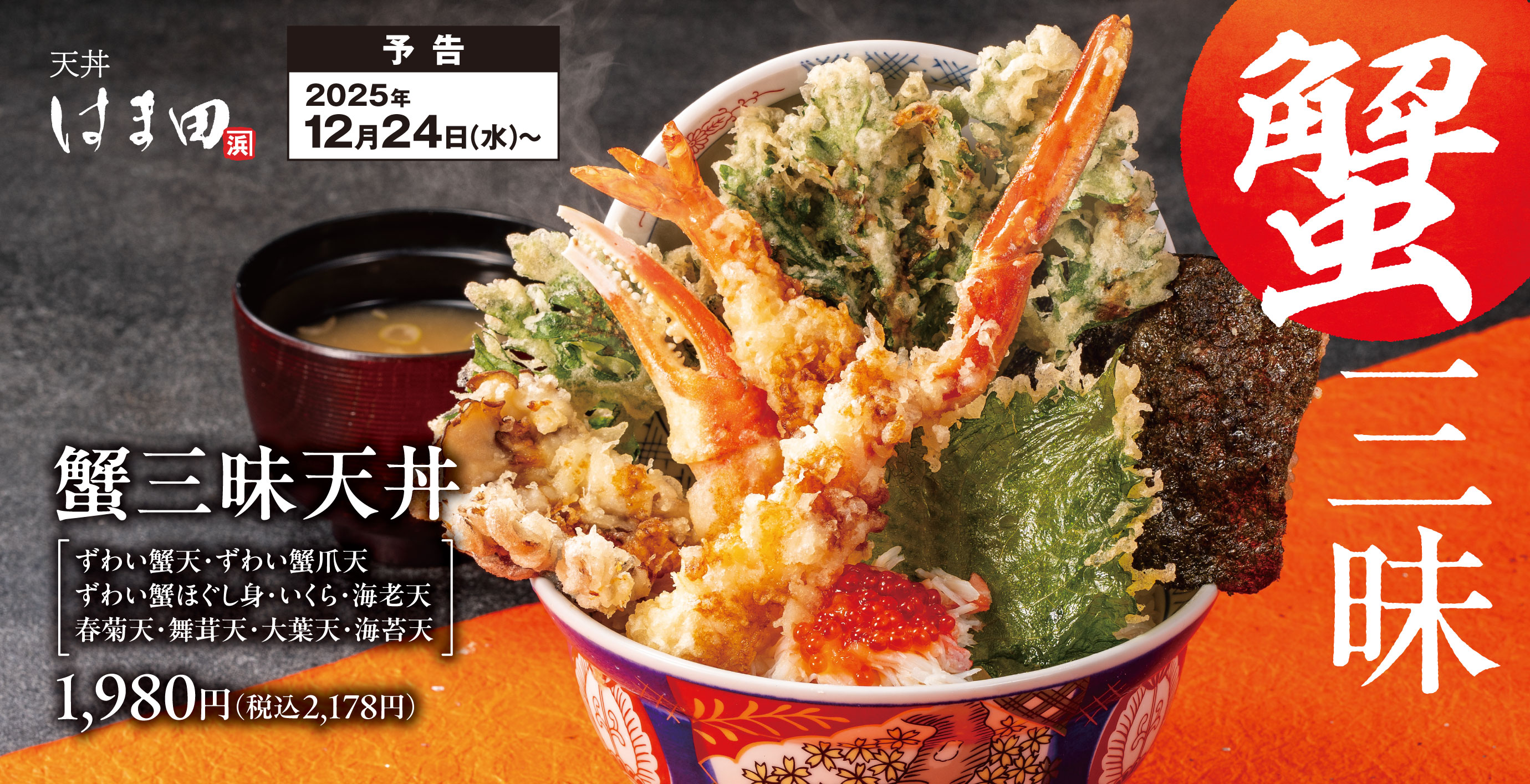 【冬の贅沢】ずわい蟹を天ぷらで味わう「蟹三昧天丼」天丼はま田・天ぷらめしはま田に新登場!