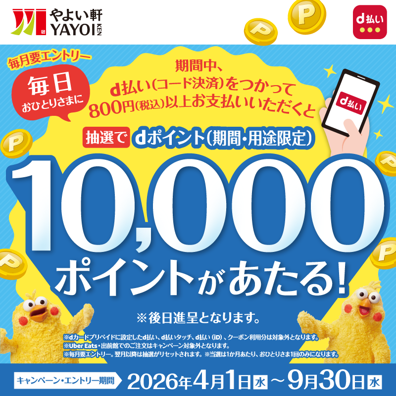 やよい軒でのd払い決済がチャンス!d払い利用(店頭・モバイルオーダー)でやよい軒にて毎日1名さまに最大10,000ポイントが当たる!