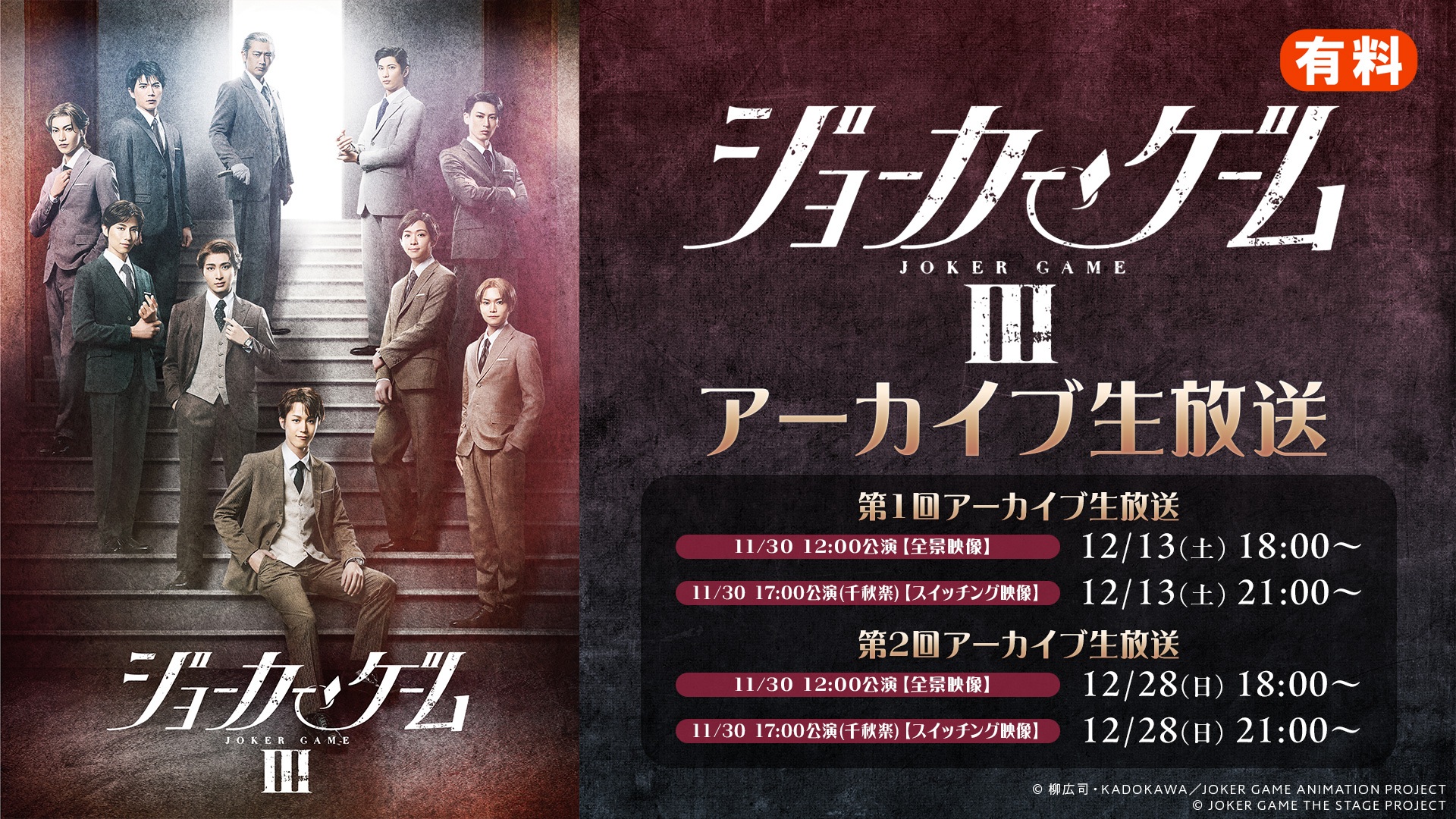 【舞台『ジョーカー・ゲームIII』】千秋楽2公演のアーカイブ生放送がニコニコ生放送にて12/13(土)、12/28(日)の2日間・全2回放送決定