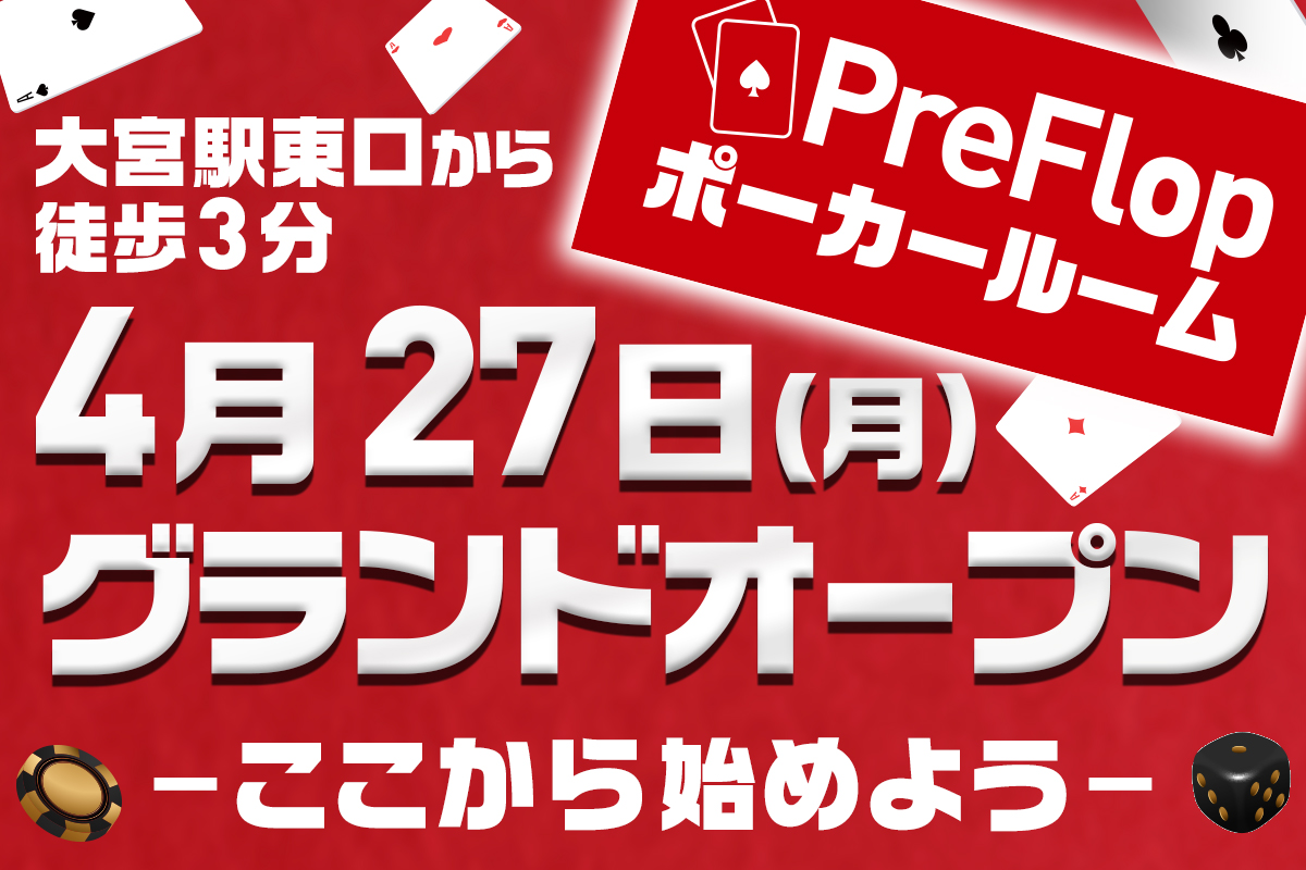 【埼玉初上陸】大宮・南銀座通り沿いに、横浜の人気ポーカールーム「PreFlop」が3号店をオープン!駅徒歩3分の好立地に全3卓完備。