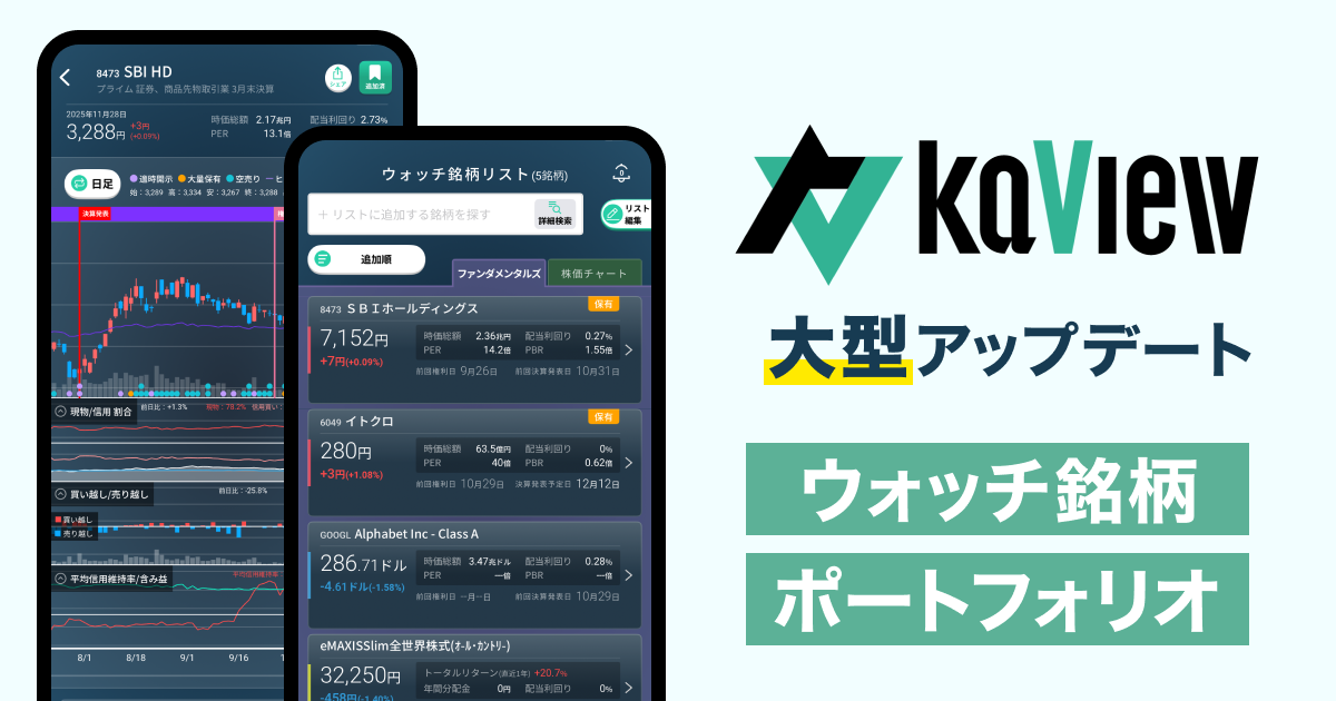 株式投資 管理・分析アプリ『カビュウ』 - 「ウォッチ銘柄」「ポートフォリオ」など大型アップデートを実施 -