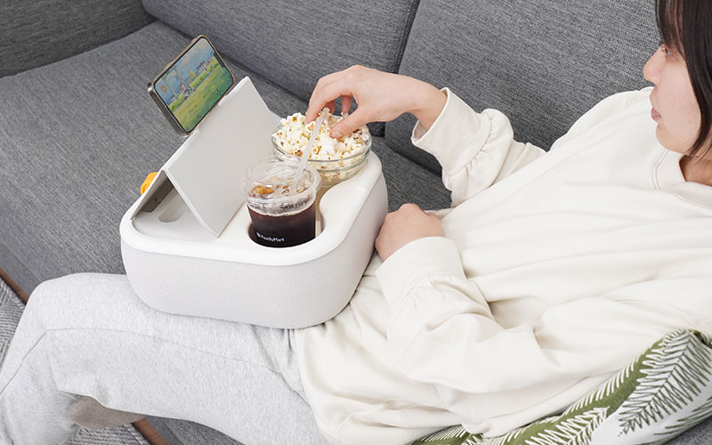 「動きたくない」を、膝上で叶える。スマホスタンド&ドリンクホルダー付き『怠惰なあなたの膝上テーブルクッション』を発売
