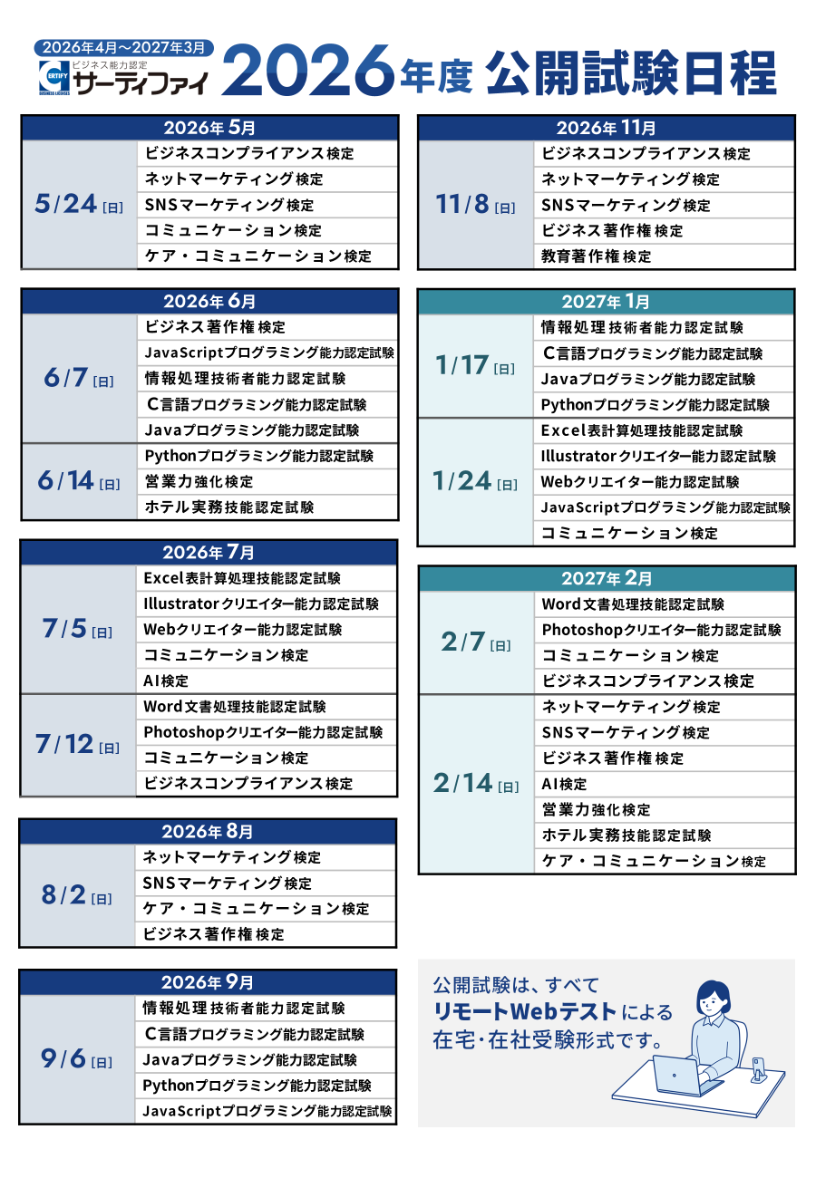 サーティファイ、主催資格・検定試験の2026年度公開試験日程を発表 -