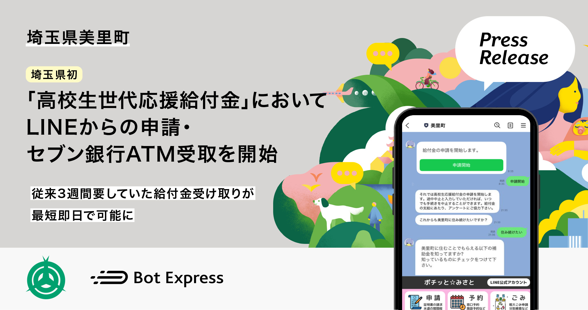 埼玉県初、埼玉県美里町が「高校生世代応援給付金」において、LINEからの申請・セブン銀行ATM受取を開始。従来3週間要していた給付金受け取りが、最短即日で可能に