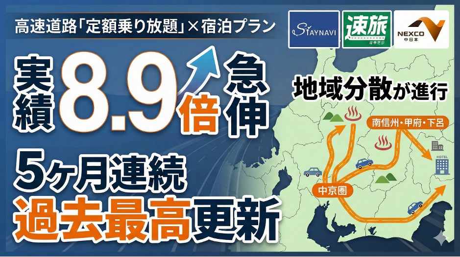 7月比で10月の実績件数が 8.9倍 に急伸。高速道路「定額乗り放題」×宿泊の連携プラン、5月の開始から5ヵ月連続で過去最高を更新中